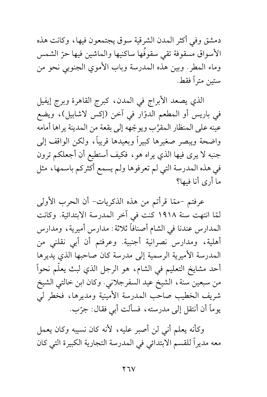 عرفتم -ممّا قرأتم من هذه الذكريات- أن الحرب الأولى لمّا انتهت سنة 1918 كنت في آخر المدرسة الابتدائية. وكانت المدارس عندنا في الشام أصنافاً ثلاثة: مدارس أميرية، ومدارس أهلية، ومدارس نصرانية أجنبية. وعرفتم أن أبي نقلني من المدرسة الأميرية الرسمية إلى مدرسة كان صاحبها الذي يديرها أحد مشايخ التعليم في الشام، هو الرجل الذي لبث يعلّم نحواً من سبعين سنة، الشيخ عيد السفرجلاني. وكان ابن خالتي الشيخ شريف الخطيب صاحب المدرسة الأمينية ومديرها، فخطر لي يوماً أن أنتقل إلى مدرسته، فسألت أبي فقال: جرّب.