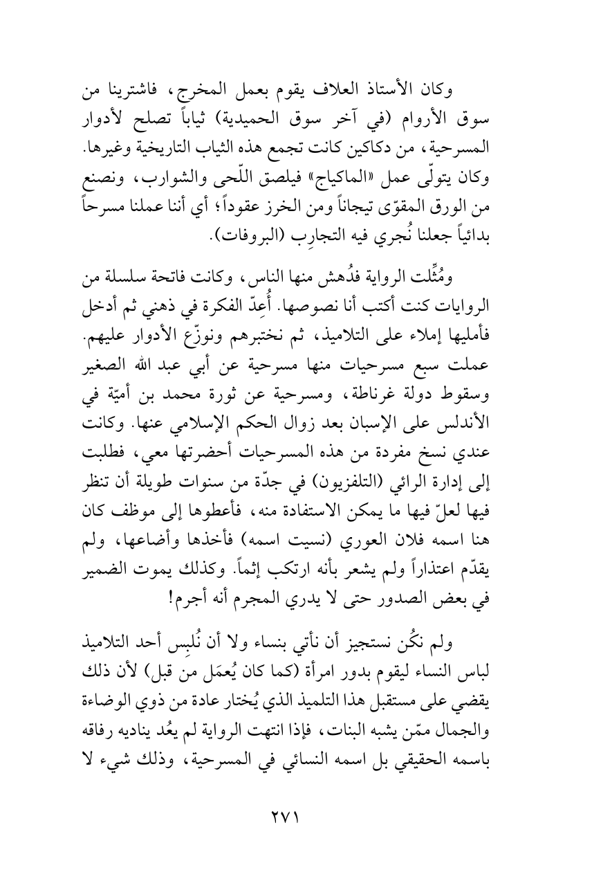 ولم نكُن نستجيز أن نأتي بنساء ولا أن نُلبِس أحد التلاميذ لباس النساء ليقوم بدور امرأة (كما كان يُعمَل من قبل) لأن ذلك يقضي على مستقبل هذا التلميذ الذي يُختار عادة من ذوي الوضاءة والجمال ممّن يشبه البنات، فإذا انتهت الرواية لم يعُد يناديه رفاقه باسمه الحقيقي بل اسمه النسائي في المسرحية، وذلك شيء لا