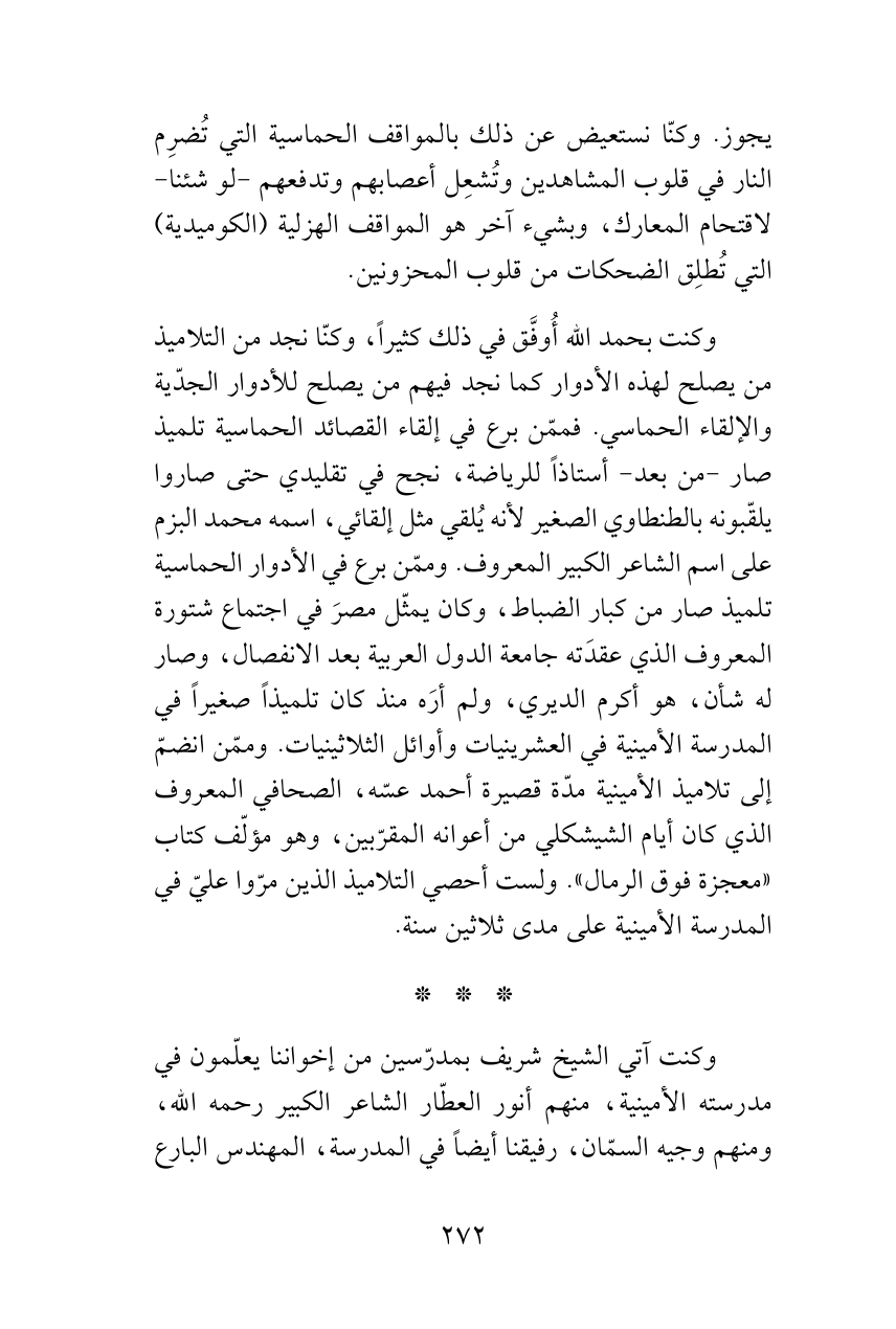 وكنت بحمد الله أُوفَّق في ذلك كثيراً، وكنّا نجد من التلاميذ من يصلح لهذه الأدوار كما نجد فيهم من يصلح للأدوار الجدّية والإلقاء الحماسي. فممّن برع في إلقاء القصائد الحماسية تلميذ صار -من بعد- أستاذاً للرياضة، نجح في تقليدي حتى صاروا يلقّبونه بالطنطاوي الصغير لأنه يُلقي مثل إلقائي، اسمه محمد البزم على اسم الشاعر الكبير المعروف. وممّن برع في الأدوار الحماسية تلميذ صار من كبار الضباط، وكان يمثّل مصرَ في اجتماع شتورة المعروف الذي عقدَته جامعة الدول العربية بعد الانفصال، وصار له شأن، هو أكرم الديري، ولم أرَه منذ كان تلميذاً صغيراً في المدرسة الأمينية في العشرينيات وأوائل الثلاثينيات. وممّن انضمّ إلى تلاميذ الأمينية مدّة قصيرة أحمد عسّه، الصحافي المعروف الذي كان أيام الشيشكلي من أعوانه المقرّبين، وهو مؤلّف كتاب «معجزة فوق الرمال». ولست أحصي التلاميذ الذين مرّوا عليّ في المدرسة الأمينية على مدى ثلاثين سنة.