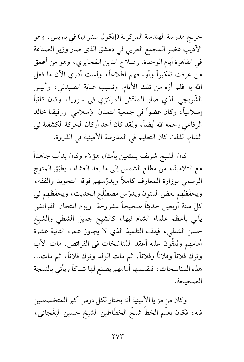 خريج مدرسة الهندسة المركزية (إيكول سنترال) في باريس، وهو الأديب عضو المجمع العربي في دمشق الذي صار وزير الصناعة في القاهرة أيام الوحدة. وصلاح الدين المَحايري، وهو من أعمق من عرفت تفكيراً وأوسعهم اطّلاعاً، ولست أدري الآن ما فعل الله به فلم أرَه من تلك الأيام. ونسيب عناية الصيدلي، وأنيس الشّربجي الذي صار المفتّش المركزي في سوريا، وكان كاتباً إسلامياً، وكان عضواً في جمعية التمدن الإسلامي. ورفيقنا خالد الرفاعي رحمه الله أيضاً، ولقد كان أحد أركان الحركة الكشفية في الشام. لذلك كان التعليم في المدرسة الأمينية في الذروة.