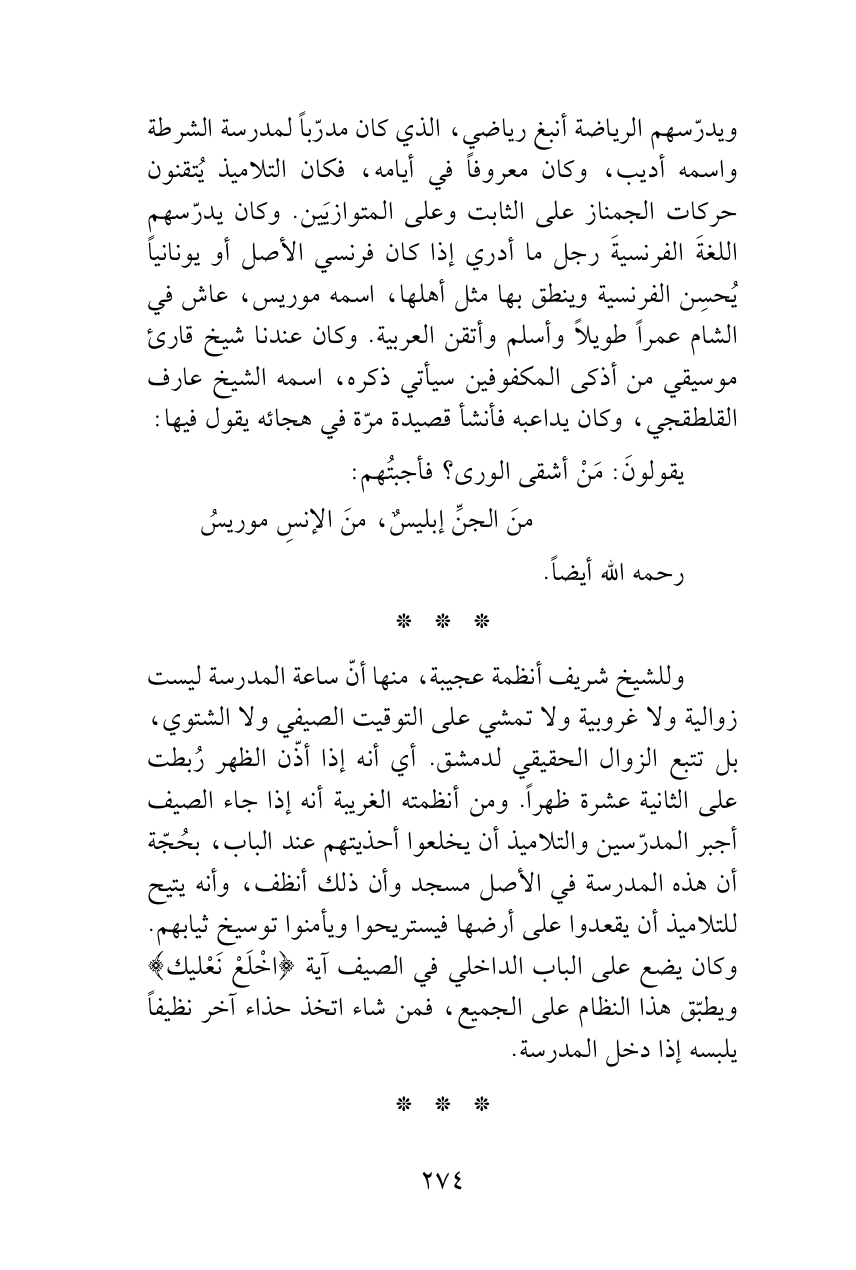 ويدرّسهم الرياضة أنبغ رياضي، الذي كان مدرّباً لمدرسة الشرطة واسمه أديب، وكان معروفاً في أيامه، فكان التلاميذ يُتقنون حركات الجمناز على الثابت وعلى المتوازيَين. وكان يدرّسهم اللغةَ الفرنسيةَ رجل ما أدري إذا كان فرنسي الأصل أو يونانياً يُحسِن الفرنسية وينطق بها مثل أهلها، اسمه موريس، عاش في الشام عمراً طويلاً وأسلم وأتقن العربية. وكان عندنا شيخ قارئ موسيقي من أذكى المكفوفين سيأتي ذكره، اسمه الشيخ عارف القلطقجي، وكان يداعبه فأنشأ قصيدة مرّة في هجائه يقول فيها: