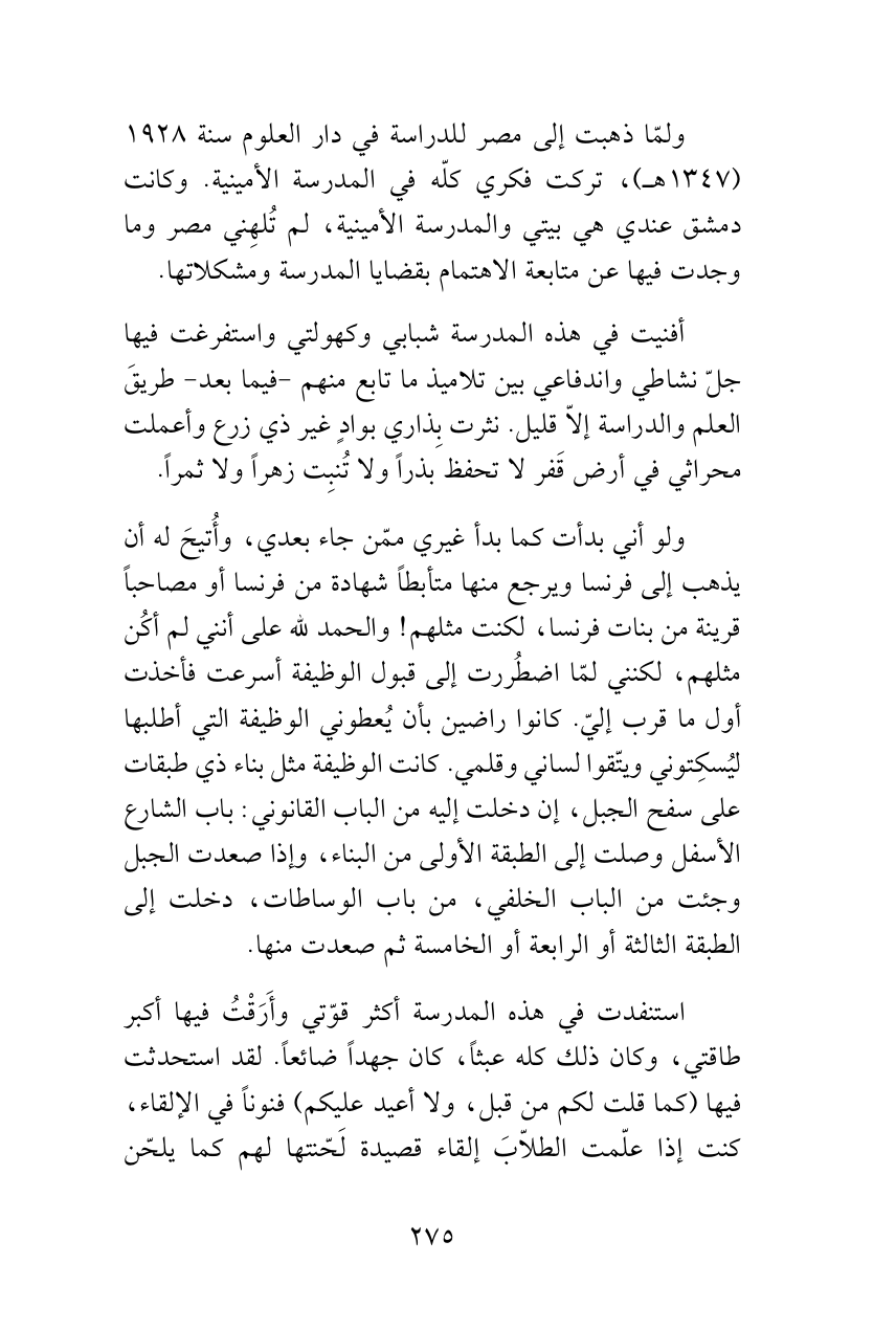 أفنيت في هذه المدرسة شبابي وكهولتي واستفرغت فيها جلّ نشاطي واندفاعي بين تلاميذ ما تابع منهم -فيما بعد- طريقَ العلم والدراسة إلاّ قليل. نثرت بِذاري بوادٍ غير ذي زرع وأعملت محراثي في أرض قَفر لا تحفظ بذراً ولا تُنبِت زهراً ولا ثمراً.