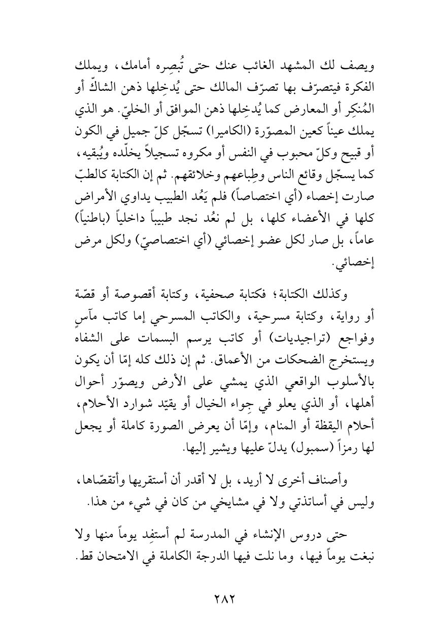 ويصف لك المشهد الغائب عنك حتى تُبصِره أمامك، ويملك الفكرة فيتصرّف بها تصرّف المالك حتى يُدخِلها ذهن الشاكّ أو المُنكِر أو المعارض كما يُدخِلها ذهن الموافق أو الخليّ. هو الذي يملك عيناً كعين المصوّرة (الكاميرا) تسجّل كلّ جميل في الكون أو قبيح وكلّ محبوب في النفس أو مكروه تسجيلاً يخلّده ويُبقيه، كما يسجّل وقائع الناس وطِباعهم وخلائقهم. ثم إن الكتابة كالطبّ صارت إخصاء (أي اختصاصاً) فلم يَعُد الطبيب يداوي الأمراض كلها في الأعضاء كلها، بل لم نعُد نجد طبيباً داخلياً (باطنياً) عاماً، بل صار لكل عضو إخصائي (أي اختصاصيّ) ولكل مرض إخصائي.