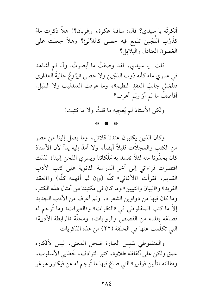 وكان الذين يكتبون عندنا قلائل، وما يصل إلينا من مصر من الكتب والمجلاّت قليلاً أيضاً، ولا أمدّ إليه يداً لأن الأستاذ كان يحذّرنا منه لئلاّ تفسد به مَلَكاتنا ويسري اللحن إلينا؛ لذلك اقتصرَت قراءاتي إلى آخر الدراسة الثانوية على كتب الأدب القديم، فقرأت «الأغاني» كلّه (وإن لم أفهمه كلّه) و «العقد الفريد» و «البيان والتبيين» وما كان في مكتبتنا من أمثال هذه الكتب وما كان فيها من دواوين الشعراء، ولم أعرف من الأدب الجديد إلاّ ما كتب المنفلوطي في «النظرات» و «العبرات» وما تُرجم له فصاغه بقلمه من القصص والروايات، ومجلّة «الرابطة الأدبية» التي تكلّمت عنها في الحلقة (22) من هذه الذكريات.