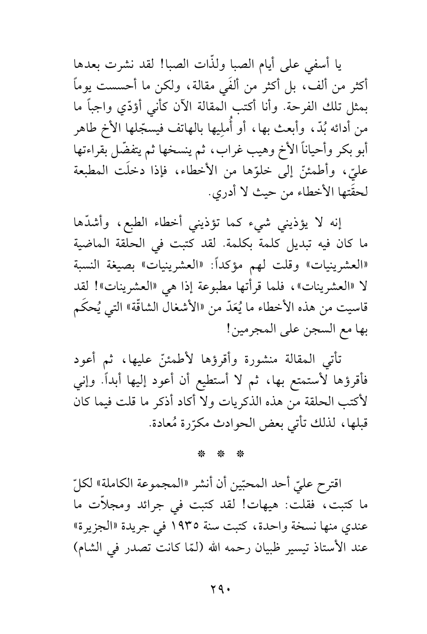 إنه لا يؤذيني شيء كما تؤذيني أخطاء الطبع، وأشدّها ما كان فيه تبديل كلمة بكلمة. لقد كتبت في الحلقة الماضية «العشرينيات» وقلت لهم مؤكداً: «العشرينيات» بصيغة النسبة لا «العشرينات»، فلما قرأتها مطبوعة إذا هي «العشرينات»! لقد قاسيت من هذه الأخطاء ما يُعَدّ من «الأشغال الشاقّة» التي يُحكَم بها مع السجن على المجرمين!
