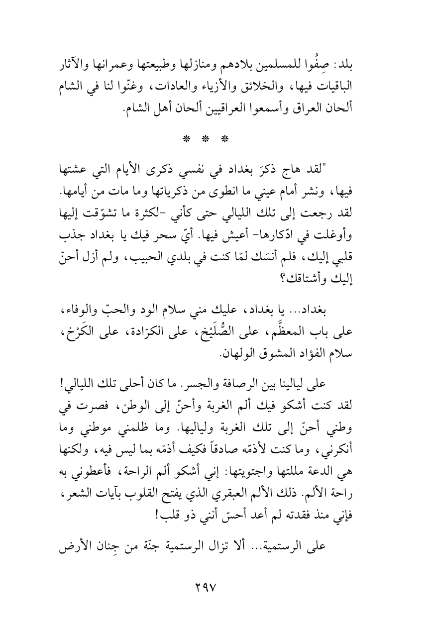 "لقد هاج ذكرَ بغداد في نفسي ذكرى الأيام التي عشتها فيها، ونشر أمام عيني ما انطوى من ذكرياتها وما مات من أيامها. لقد رجعت إلى تلك الليالي حتى كأني -لكثرة ما تشوّقت إليها وأوغلت في ادّكارها- أعيش فيها. أيّ سحر فيك يابغداد جذب قلبي إليك، فلم أنسَك لمّا كنت في بلدي الحبيب، ولم أزل أحنّ إليك وأشتاقك؟