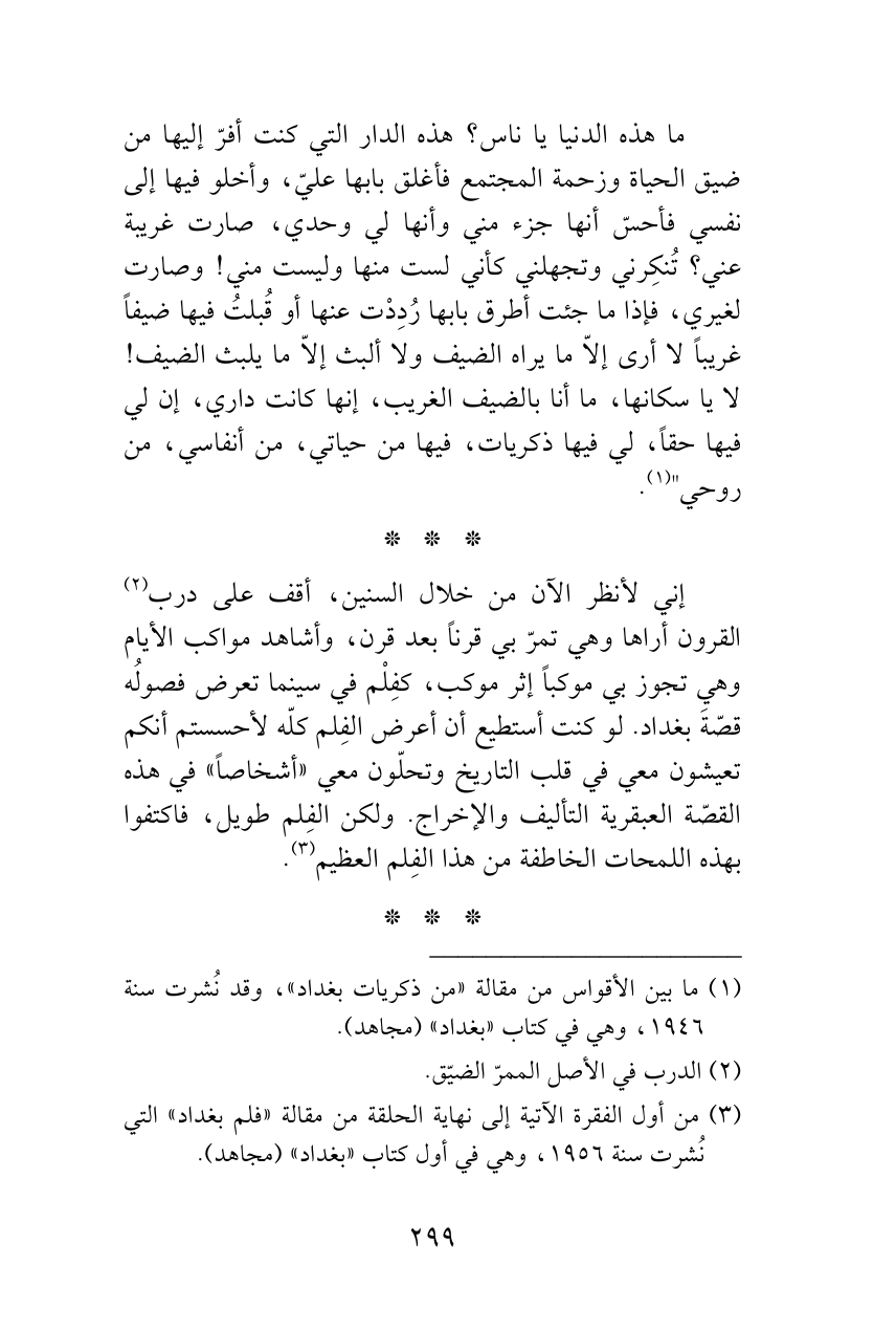 (¬3) من أول الفقرة الآتية إلى نهاية الحلقة من مقالة «فلم بغداد» التي نُشرت سنة 1956، وهي في أول كتاب «بغداد» (مجاهد).
