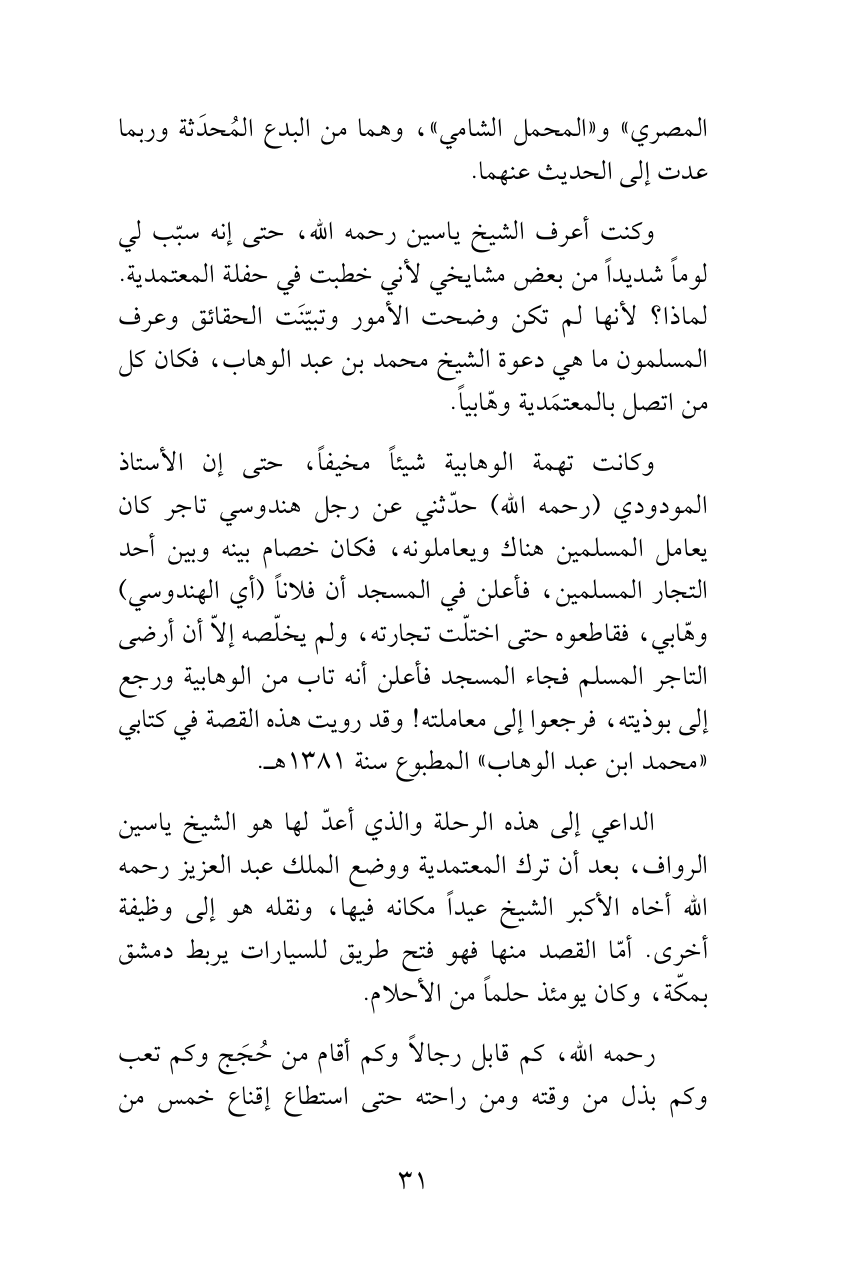 وكنت أعرف الشيخ ياسين رحمه الله، حتى إنه سبّب لي لوماً شديداً من بعض مشايخي لأني خطبت في حفلة المعتمدية. لماذا؟ لأنها لم تكن وضحت الأمور وتبيّنَت الحقائق وعرف المسلمون ما هي دعوة الشيخ محمد بن عبد الوهاب، فكان كل من اتصل بالمعتمَدية وهّابياً.