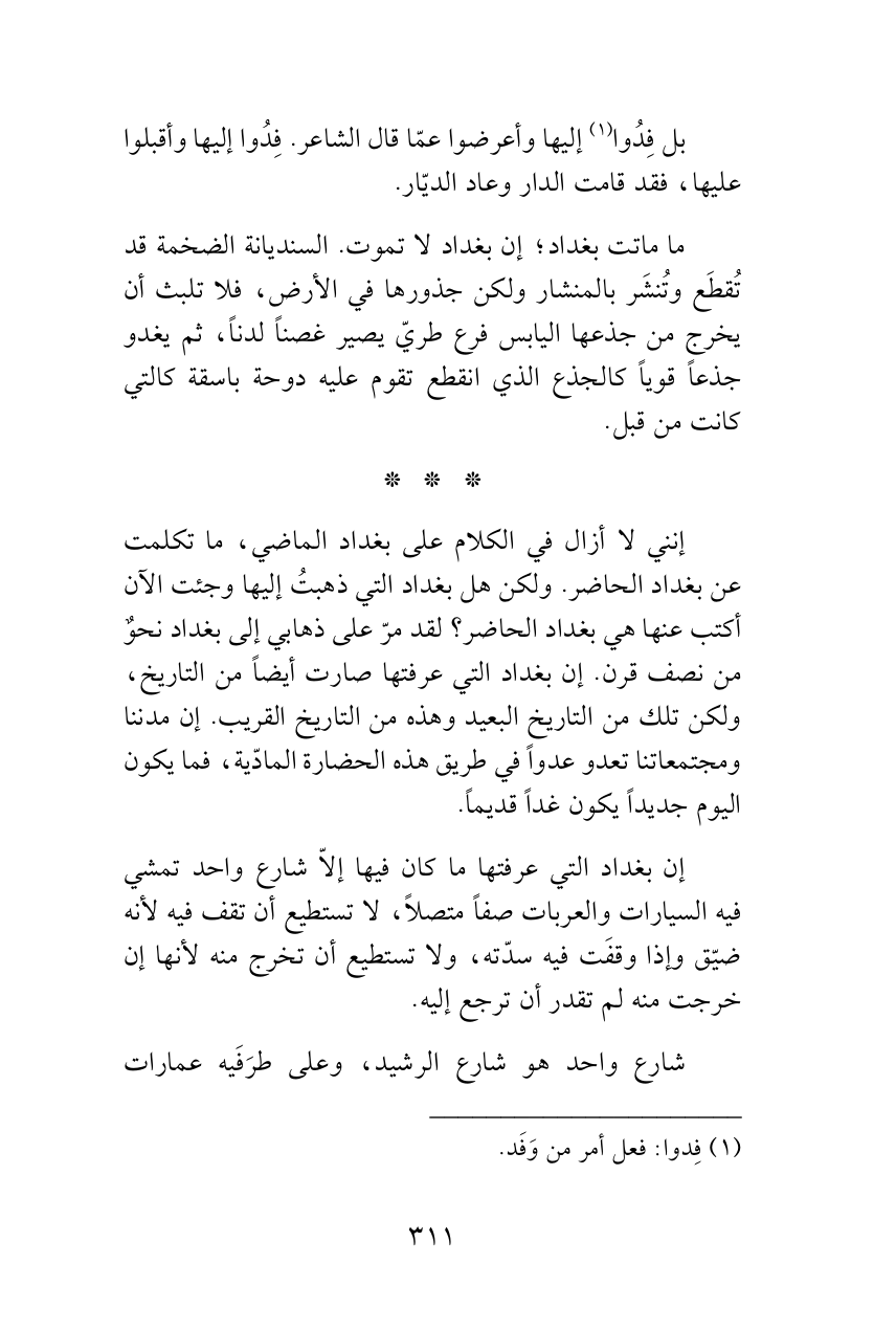 إنني لا أزال في الكلام على بغداد الماضي، ما تكلمت عن بغداد الحاضر. ولكن هل بغداد التي ذهبتُ إليها وجئت الآن أكتب عنها هي بغداد الحاضر؟ لقد مرّ على ذهابي إلى بغداد نحوٌ من نصف قرن. إن بغداد التي عرفتها صارت أيضاً من التاريخ، ولكن تلك من التاريخ البعيد وهذه من التاريخ القريب. إن مدننا ومجتمعاتنا تعدو عدواً في طريق هذه الحضارة المادّية، فما يكون اليوم جديداً يكون غداً قديماً.