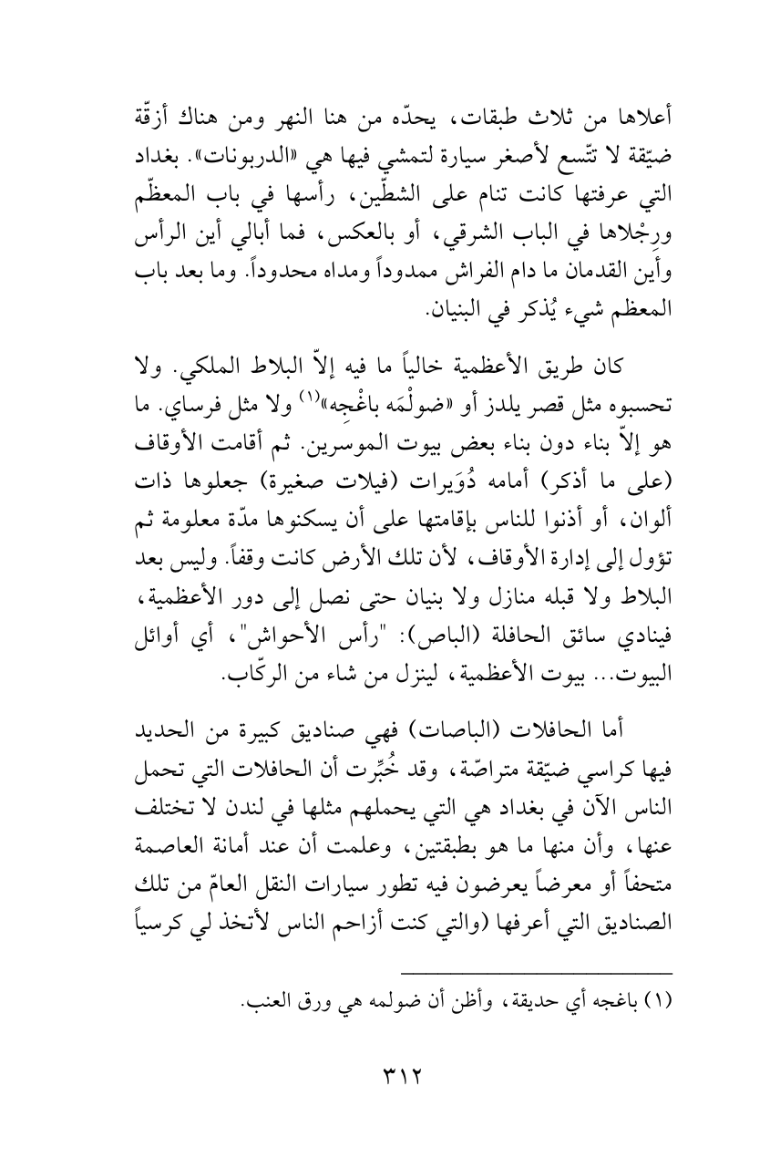 أعلاها من ثلاث طبقات، يحدّه من هنا النهر ومن هناك أزقّة ضيّقة لا تتّسع لأصغر سيارة لتمشي فيها هي «الدربونات». بغداد التي عرفتها كانت تنام على الشطّين، رأسها في باب المعظّم ورِجْلاها في الباب الشرقي، أو بالعكس، فما أبالي أين الرأس وأين القدمان ما دام الفراش ممدوداً ومداه محدوداً. وما بعد باب المعظم شيء يُذكر في البنيان.