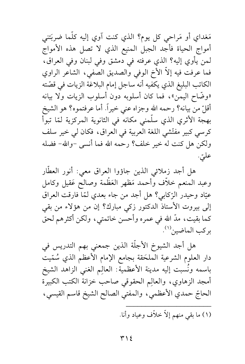 هل أجد زملائي الذين جاؤوا العراق معي: أنور العطّار وعبد المنعم خلاّف وأحمد مَظهر العَظْمة وصالح عَقيل وكامل عيّاد وحيدر الرّكابي؟ هل أجد من جاء بعدي لمّا فارقت العراق إلى بيروت الأستاذ الدكتور زكي مبارك؟ إن من هؤلاء من بقي كما بقيت، مدّ الله في عمره وأحسن خاتمتي، ولكن أكثرهم لحق بركب الماضين (¬1).