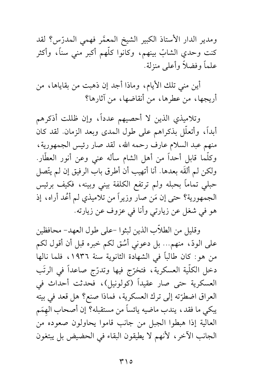 وتلاميذي الذين لا أحصيهم عدداً، وإن ظللت أذكرهم أبداً، وأتعلّل بذكراهم على طول المدى وبعد الزمان. لقد كان منهم عبد السلام عارف رحمه الله، لقد صار رئيس الجمهورية، وكلّما قابل أحداً من أهل الشام سأله عني وعن أنور العطّار. ولكن لم ألقَه بعدها. أنا أتهيب أن أطرق باب الرفيق إن لم يتّصل حبلي تماماً بحبله ولم ترتفع الكلفة بيني وبينه، فكيف برئيس الجمهورية؟ حتى إن مَن صار وزيراً من تلاميذي لم أعُد أراه، إذ هو في شغل عن زيارتي وأنا في عزوف عن زيارته.