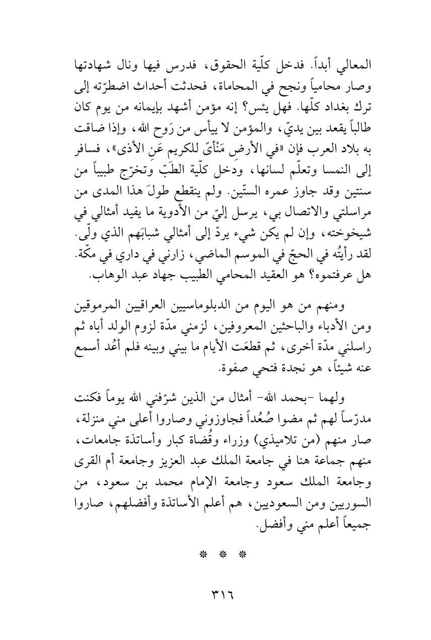 المعالي أبداً. فدخل كلّية الحقوق، فدرس فيها ونال شهادتها وصار محامياً ونجح في المحاماة، فحدثت أحداث اضطرّته إلى ترك بغداد كلّها. فهل يئس؟ إنه مؤمن أشهد بإيمانه من يوم كان طالباً يقعد بين يديّ، والمؤمن لا ييأس من رَوح الله، وإذا ضاقت به بلاد العرب فإن «في الأرضِ مَنْأىً للكريمِ عَنِ الأذى»، فسافر إلى النمسا وتعلّم لسانها، ودخل كلّية الطبّ وتخرّج طبيباً من سنتين وقد جاوز عمره الستّين. ولم ينقطع طولَ هذا المدى من مراسلتي والاتصال بي، يرسل إليّ من الأدوية ما يفيد أمثالي في شيخوخته، وإن لم يكن شيء يردّ إلى أمثالي شبابَهم الذي ولّى. لقد رأيتُه في الحجّ في الموسم الماضي، زارني في داري في مكّة. هل عرفتموه؟ هو العقيد المحامي الطبيب جهاد عبد الوهاب.