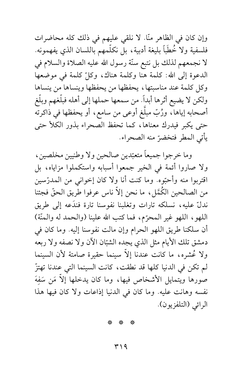 وإن كان في الظاهر منّا. لا نلقي عليهم في ذلك كله محاضرات فلسفية ولا خُطَباً بليغة أدبية، بل نكلّمهم باللسان الذي يفهمونه. لا نجمعهم لذلك بل نتبع سنّة رسول الله عليه الصلاة والسلام في الدعوة إلى الله: كلمة هنا وكلمة هناك، وكلّ كلمة في موضعها وكل كلمة عند مناسبتها، يحفظها من يحفظها وينساها من ينساها ولكن لا يضيع أثرها أبداً. من سمعها حملها إلى أهله فبلّغهم وبلّغ أصحابه إياها، ورُبّ مبلَّغ أوعى من سامع، أو يحفظها في ذاكرته حتى يكبر فيدرك معناها، كما تحفظ الصحراء بذور الكلأ حتى يأتي المطر فتخضرّ منه الصحراء.