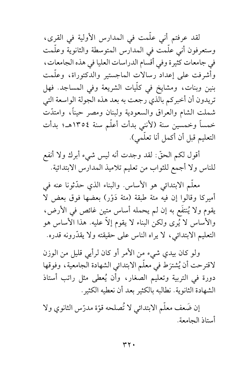 ولو كان بيدي شيء من الأمر أو كان لرأيي قليل من الوزن لاقترحت أن يُشترَط في معلّم الابتدائي الشهادة الجامعية، وفوقها دورة في التربية وتعليم الصغار، وأن يُعطى مثل راتب أستاذ الشهادة الثانوية. نطالبه بالكثير بعد أن نعطيه الكثير.