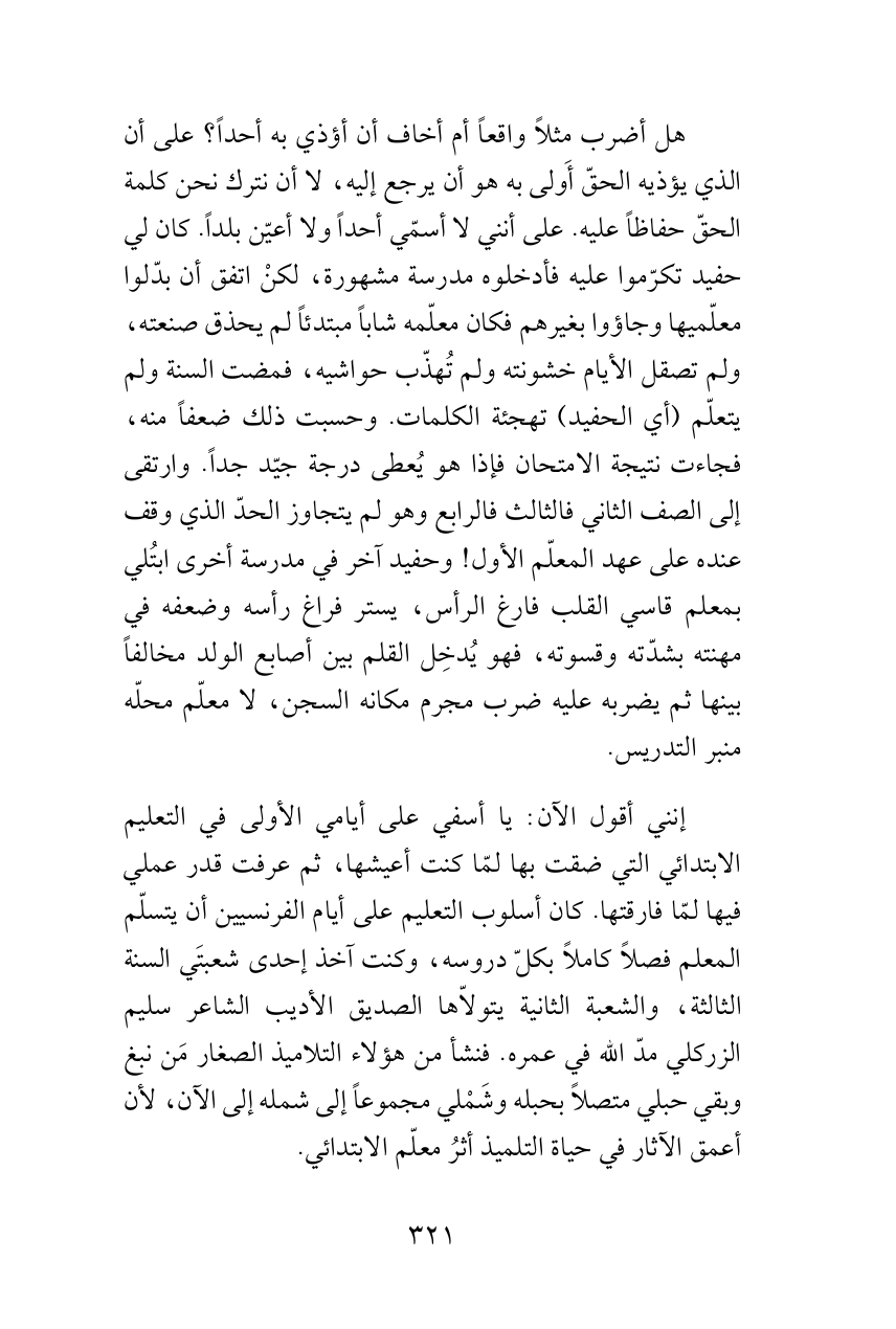 هل أضرب مثلاً واقعاً أم أخاف أن أؤذي به أحداً؟ على أن الذي يؤذيه الحقّ أَولى به هو أن يرجع إليه، لا أن نترك نحن كلمة الحقّ حفاظاً عليه. على أنني لا أسمّي أحداً ولا أعيّن بلداً. كان لي حفيد تكرّموا عليه فأدخلوه مدرسة مشهورة، لكنْ اتفق أن بدّلوا معلّميها وجاؤوا بغيرهم فكان معلّمه شاباً مبتدئاً لم يحذق صنعته، ولم تصقل الأيام خشونته ولم تُهذّب حواشيه، فمضت السنة ولم يتعلّم (أي الحفيد) تهجئة الكلمات. وحسبت ذلك ضعفاً منه، فجاءت نتيجة الامتحان فإذا هو يُعطى درجة جيّد جداً. وارتقى إلى الصف الثاني فالثالث فالرابع وهو لم يتجاوز الحدّ الذي وقف عنده على عهد المعلّم الأول! وحفيد آخر في مدرسة أخرى ابتُلي بمعلم قاسي القلب فارغ الرأس، يستر فراغ رأسه وضعفه في مهنته بشدّته وقسوته، فهو يُدخِل القلم بين أصابع الولد مخالفاً بينها ثم يضربه عليه ضرب مجرم مكانه السجن، لا معلّم محلّه منبر التدريس.