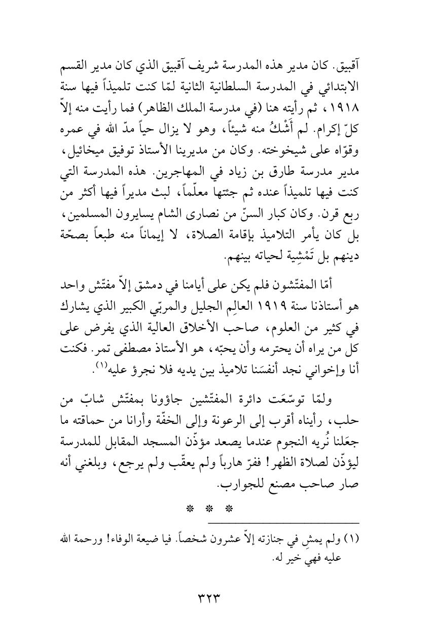 آقبيق. كان مدير هذه المدرسة شريف آقبيق الذي كان مدير القسم الابتدائي في المدرسة السلطانية الثانية لمّا كنت تلميذاً فيها سنة 1918، ثم رأيته هنا (في مدرسة الملك الظاهر) فما رأيت منه إلاّ كلّ إكرام. لم أَشْكُ منه شيئاً، وهو لا يزال حياً مدّ الله في عمره وقوّاه على شيخوخته. وكان من مديرينا الأستاذ توفيق ميخائيل، مدير مدرسة طارق بن زياد في المهاجرين. هذه المدرسة التي كنت فيها تلميذاً عنده ثم جئتها معلّماً، لبث مديراً فيها أكثر من ربع قرن. وكان كبار السنّ من نصارى الشام يسايرون المسلمين، بل كان يأمر التلاميذ بإقامة الصلاة، لا إيماناً منه طبعاً بصحّة دينهم بل تَمْشِية لحياته بينهم.