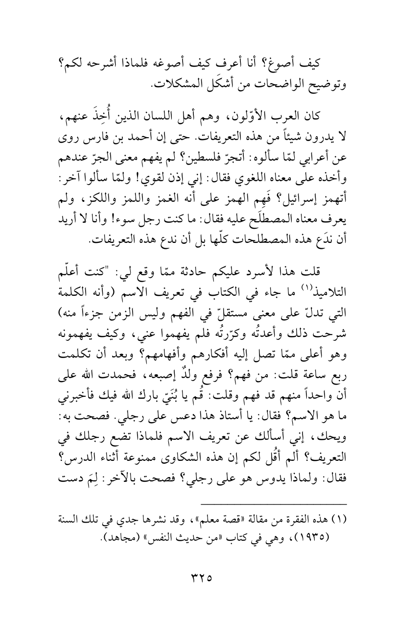 كان العرب الأوّلون، وهم أهل اللسان الذين أُخِذَ عنهم، لا يدرون شيئاً من هذه التعريفات. حتى إن أحمد بن فارس روى عن أعرابي لمّا سألوه: أتجرّ فلسطين؟ لم يفهم معنى الجرّ عندهم وأخذه على معناه اللغوي فقال: إني إذن لقوي! ولمّا سألوا آخر: أتهمز إسرائيل؟ فَهِم الهمز على أنه الغمز واللمز واللكز، ولم يعرف معناه المصطلَح عليه فقال: ما كنت رجل سوء! وأنا لا أريد أن ندَع هذه المصطلحات كلّها بل أن ندع هذه التعريفات.