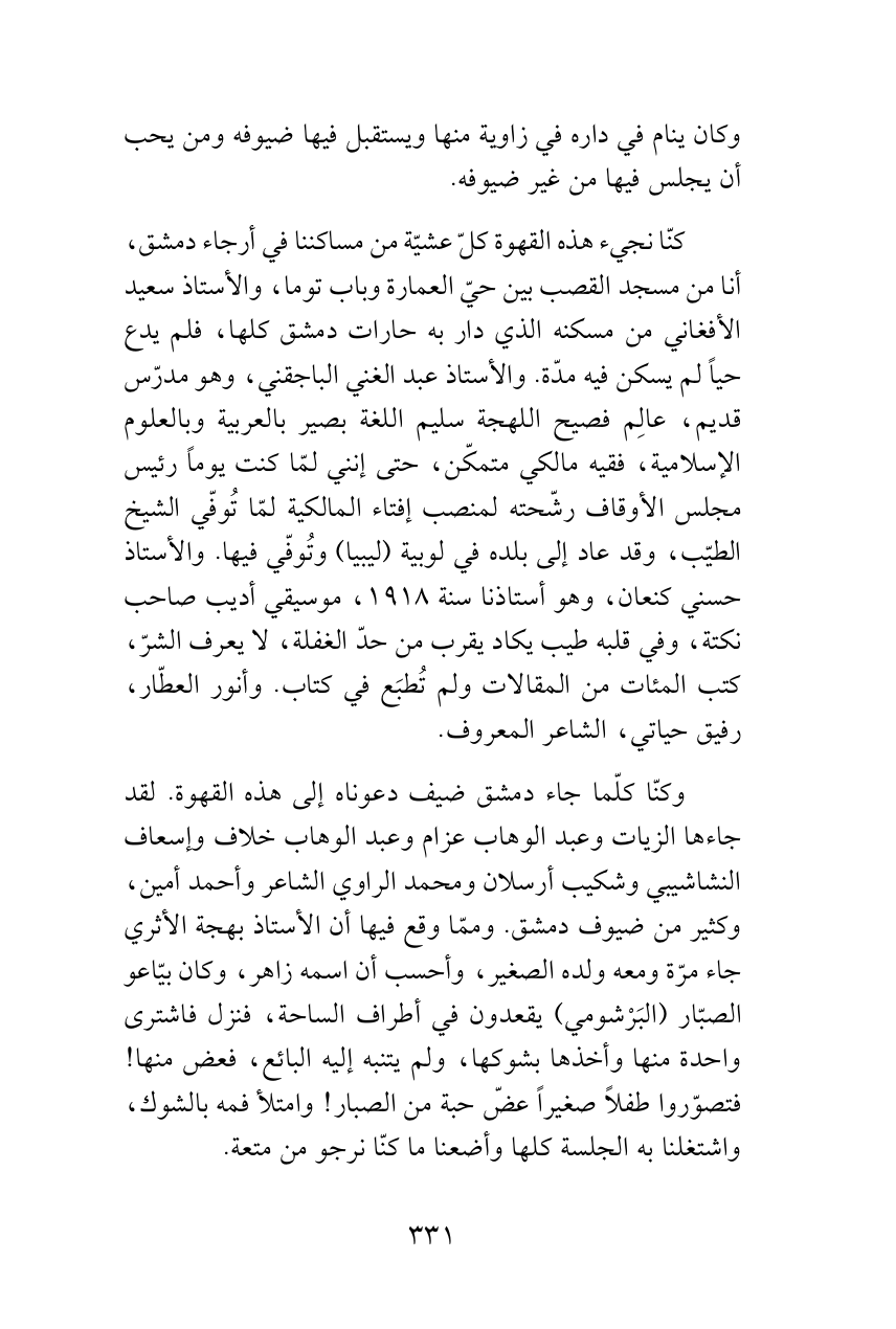 كنّا نجيء هذه القهوة كلّ عشيّة من مساكننا في أرجاء دمشق، أنا من مسجد القصب بين حيّ العمارة وباب توما، والأستاذ سعيد الأفغاني من مسكنه الذي دار به حارات دمشق كلها، فلم يدع حياً لم يسكن فيه مدّة. والأستاذ عبد الغني الباجقني، وهو مدرّس قديم، عالِم فصيح اللهجة سليم اللغة بصير بالعربية وبالعلوم الإسلامية، فقيه مالكي متمكّن، حتى إنني لمّا كنت يوماً رئيس مجلس الأوقاف رشّحته لمنصب إفتاء المالكية لمّا تُوفّي الشيخ الطيّب، وقد عاد إلى بلده في لوبية (ليبيا) وتُوفّي فيها. والأستاذ حسني كنعان، وهو أستاذنا سنة 1918، موسيقي أديب صاحب نكتة، وفي قلبه طيب يكاد يقرب من حدّ الغفلة، لا يعرف الشرّ، كتب المئات من المقالات ولم تُطبَع في كتاب. وأنور العطّار، رفيق حياتي، الشاعر المعروف.