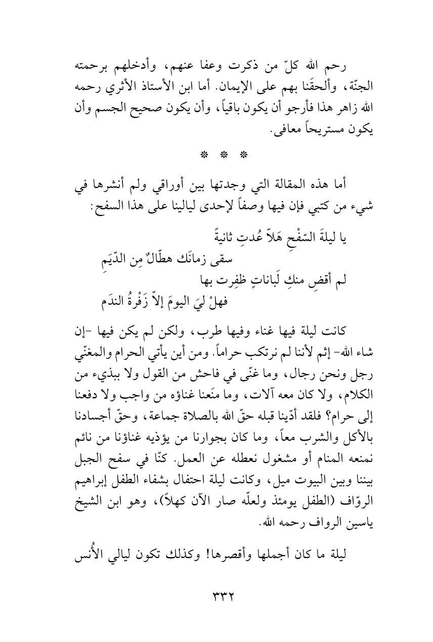 كانت ليلة فيها غناء وفيها طرب، ولكن لم يكن فيها -إن شاء الله- إثم لأننا لم نرتكب حراماً. ومن أين يأتي الحرام والمغنّي رجل ونحن رجال، وما غنّى في فاحش من القول ولا ببذيء من الكلام، ولا كان معه آلات، وما منَعنا غناؤه من واجب ولا دفعنا إلى حرام؟ فلقد أدّينا قبله حقّ الله بالصلاة جماعة، وحقّ أجسادنا بالأكل والشرب معاً، وما كان بجوارنا من يؤذيه غناؤنا من نائم نمنعه المنام أو مشغول نعطله عن العمل. كنّا في سفح الجبل بيننا وبين البيوت ميل، وكانت ليلة احتفال بشفاء الطفل إبراهيم الروّاف (الطفل يومئذ ولعلّه صار الآن كهلاً)، وهو ابن الشيخ ياسين الرواف رحمه الله.