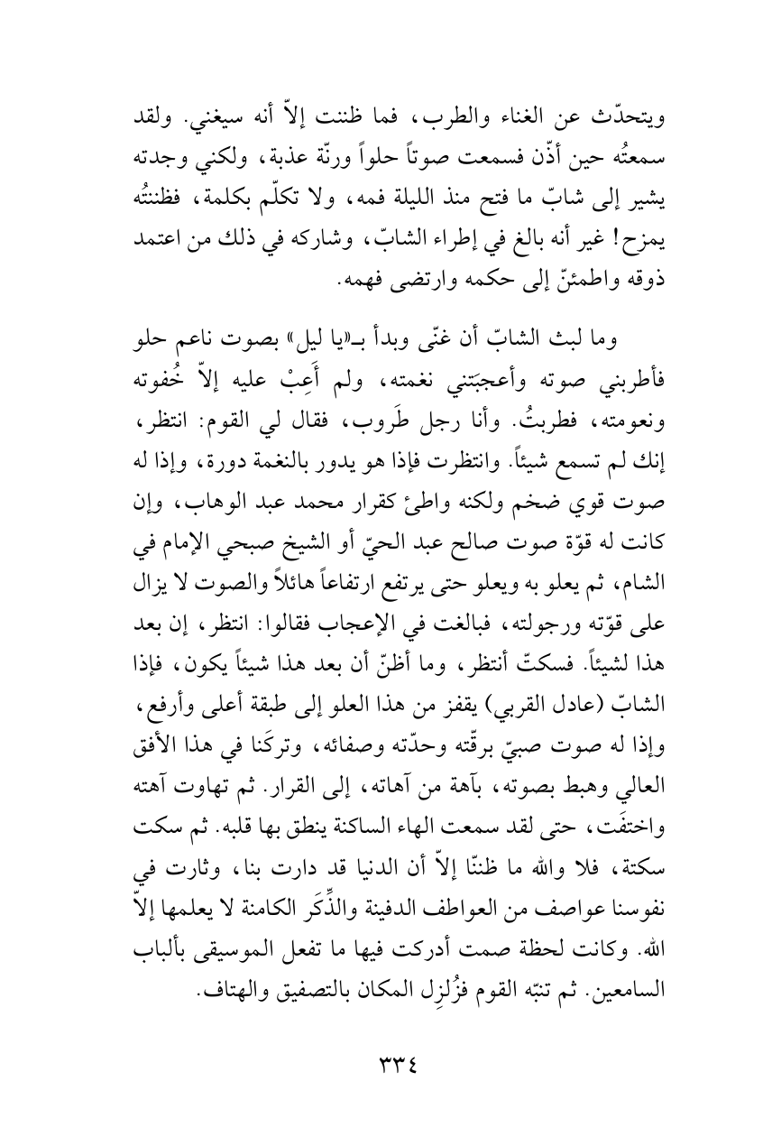 ويتحدّث عن الغناء والطرب، فما ظننت إلاّ أنه سيغني. ولقد سمعتُه حين أذّن فسمعت صوتاً حلواً ورنّة عذبة، ولكني وجدته يشير إلى شابّ ما فتح منذ الليلة فمه، ولا تكلّم بكلمة، فظننتُه يمزح! غير أنه بالغ في إطراء الشابّ، وشاركه في ذلك من اعتمد ذوقه واطمئنّ إلى حكمه وارتضى فهمه.
