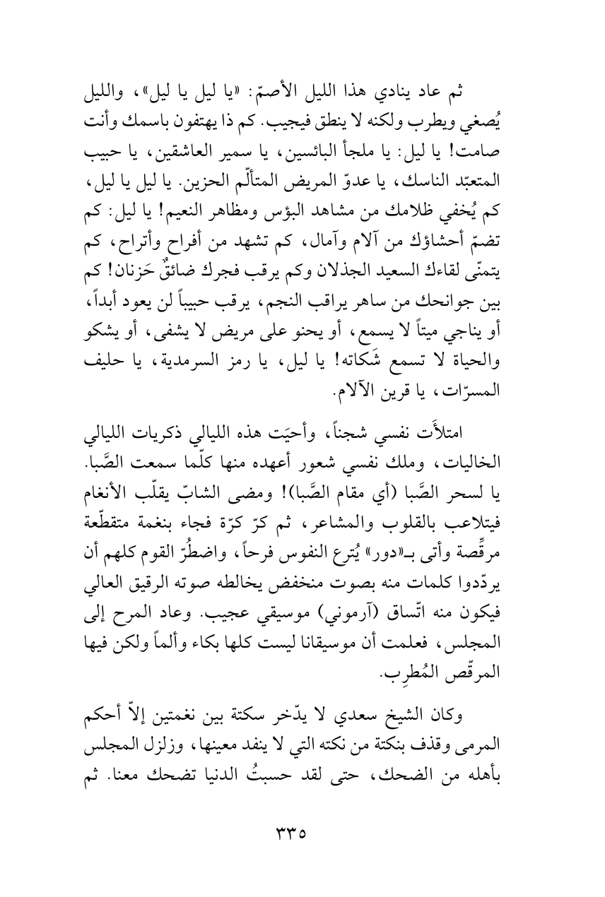 امتلأَت نفسي شجناً، وأحيَت هذه الليالي ذكريات الليالي الخاليات، وملك نفسي شعور أعهده منها كلّما سمعت الصَّبا. يالسحر الصَّبا (أي مقام الصَّبا)! ومضى الشابّ يقلّب الأنغام فيتلاعب بالقلوب والمشاعر، ثم كرّ كرّة فجاء بنغمة متقطّعة مرقِّصة وأتى بـ «دور» يُترع النفوس فرحاً، واضطُرّ القوم كلهم أن يردّدوا كلمات منه بصوت منخفض يخالطه صوته الرقيق العالي فيكون منه اتّساق (آرموني) موسيقي عجيب. وعاد المرح إلى المجلس، فعلمت أن موسيقانا ليست كلها بكاء وألماً ولكن فيها المرقّص المُطرِب.
