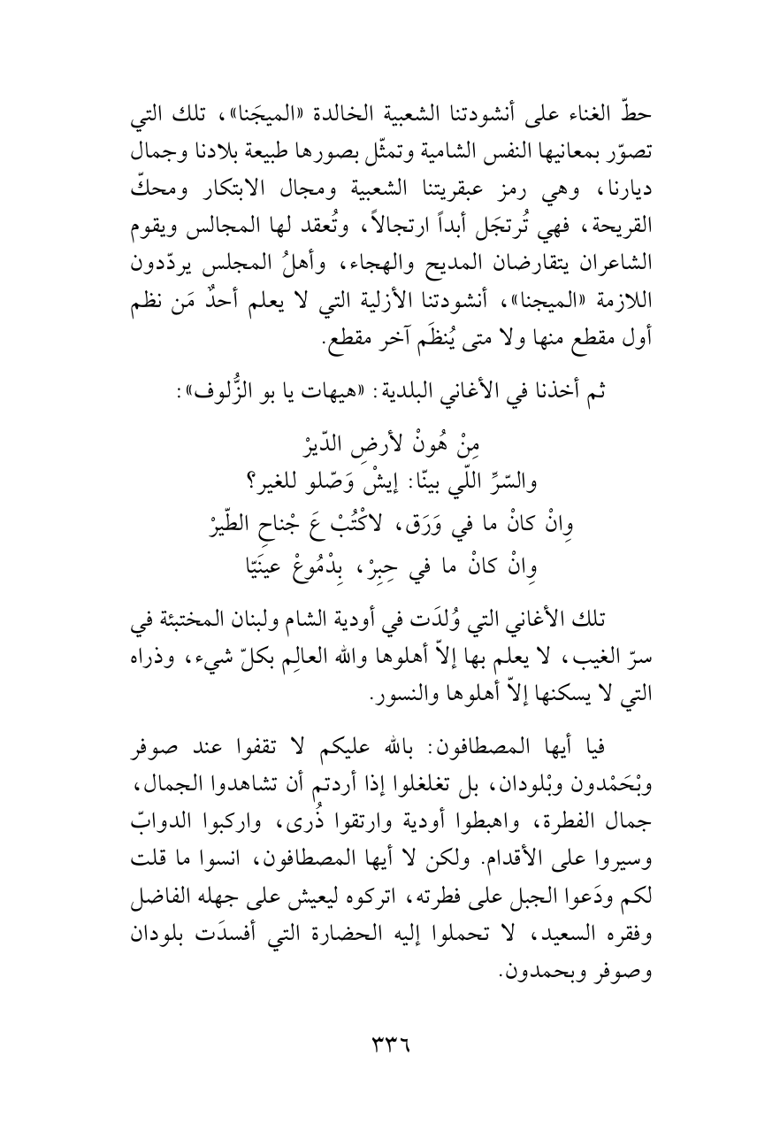 تلك الأغاني التي وُلدَت في أودية الشام ولبنان المختبئة في سرّ الغيب، لا يعلم بها إلاّ أهلوها والله العالِم بكلّ شيء، وذراه التي لا يسكنها إلاّ أهلوها والنسور.