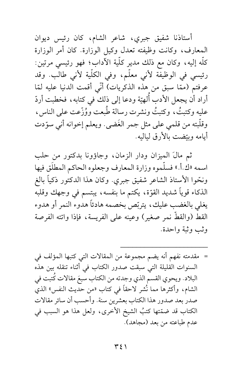 أستاذنا شفيق جبري، شاعر الشام، كان رئيس ديوان المعارف، وكانت وظيفته تعدل وكيل الوزارة. كان أمر الوزارة كلّه إليه، وكان مع ذلك مدير كلّية الآداب؛ فهو رئيسي مرتين: رئيسي في الوظيفة لأني معلّم، وفي الكلّية لأني طالب. وقد عرفتم (ممّا سبق من هذه الذكريات) أنّي أقمت الدنيا عليه لمّا أراد أن يجعل الأدب أُلهيّة ودعا إلى ذلك في كتابه، فخطبت أردّ عليه وكتبتُ، وكتبتُ ونشرت رسالة طُبعت ووُزّعت على الناس، وقلّبته من قلمي على مثل جمر الغَضى. ويعلم إخوانه أني سوّدت أيامه وبيّضت بالأرق لياليه.