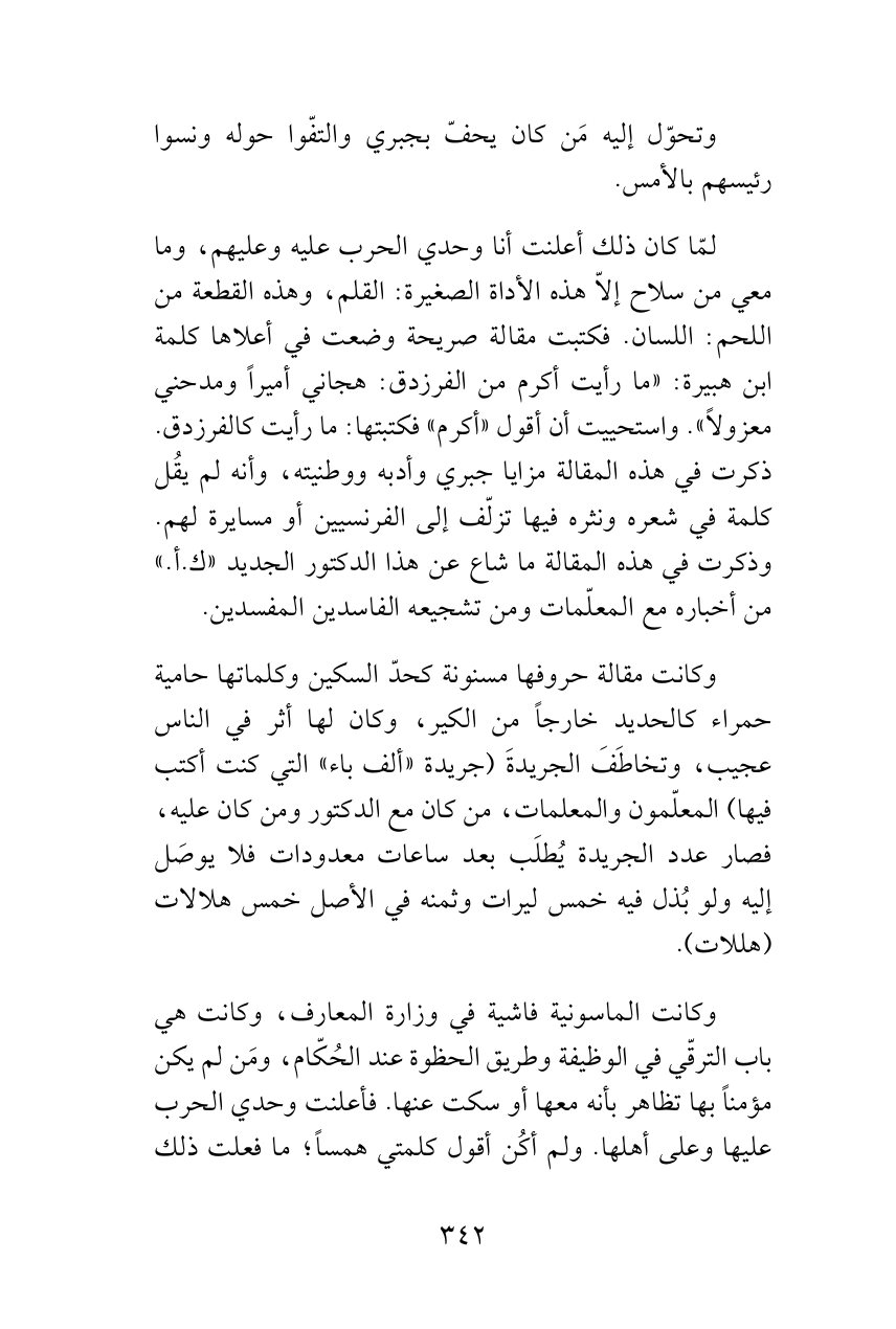 لمّا كان ذلك أعلنت أنا وحدي الحرب عليه وعليهم، وما معي من سلاح إلاّ هذه الأداة الصغيرة: القلم، وهذه القطعة من اللحم: اللسان. فكتبت مقالة صريحة وضعت في أعلاها كلمة ابن هبيرة: «ما رأيت أكرم من الفرزدق: هجاني أميراً ومدحني معزولاً». واستحييت أن أقول «أكرم» فكتبتها: ما رأيت كالفرزدق. ذكرت في هذه المقالة مزايا جبري وأدبه ووطنيته، وأنه لم يقُل كلمة في شعره ونثره فيها تزلّف إلى الفرنسيين أو مسايرة لهم. وذكرت في هذه المقالة ما شاع عن هذا الدكتور الجديد «ك. أ.» من أخباره مع المعلّمات ومن تشجيعه الفاسدين المفسدين.