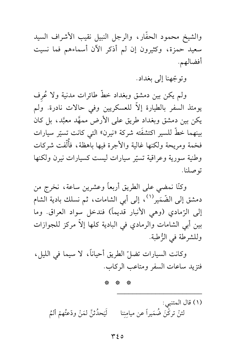وكنّا نمضي على الطريق أربعاً وعشرين ساعة، نخرج من دمشق إلى الضّمَير (¬1)، إلى أبي الشامات، ثم نسلك بادية الشام إلى الرّمادي (وهي الأنبار قديماً) فندخل سواد العراق. وما بين أبي الشامات والرمادي في البادية كلها إلاّ مركز للجوازات وللشرطة في الرُّطبة.