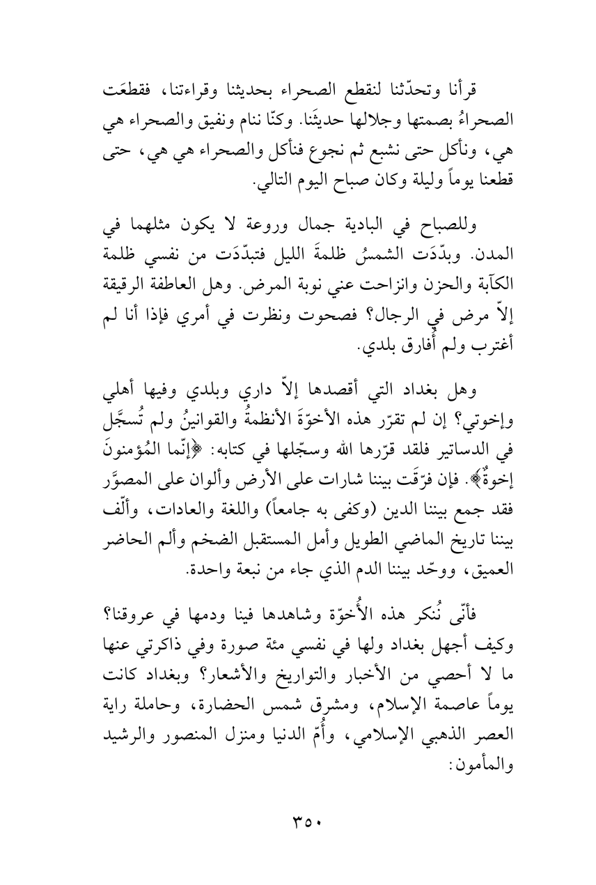 وهل بغداد التي أقصدها إلاّ داري وبلدي وفيها أهلي وإخوتي؟ إن لم تقرّر هذه الأخوّةَ الأنظمةُ والقوانينُ ولم تُسجَّل في الدساتير فلقد قرّرها الله وسجّلها في كتابه: {إنّما المُؤمنونَ إخوةٌ}. فإن فرّقَت بيننا شارات على الأرض وألوان على المصوَّر فقد جمع بيننا الدين (وكفى به جامعاً) واللغة والعادات، وألّف بيننا تاريخ الماضي الطويل وأمل المستقبل الضخم وألم الحاضر العميق، ووحّد بيننا الدم الذي جاء من نبعة واحدة.
