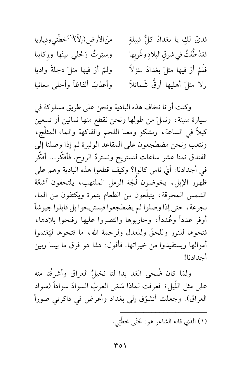 ولمّا كان ضُحى الغد بدا لنا نخيلُ العراق وأشرفْنا منه على مثل اللّيل؛ فعرفت لماذا سَمّى العربُ السوادَ سواداً (سواد العراق). وجعلت أتشوّق إلى بغداد وأعرض في ذاكرتي صورا