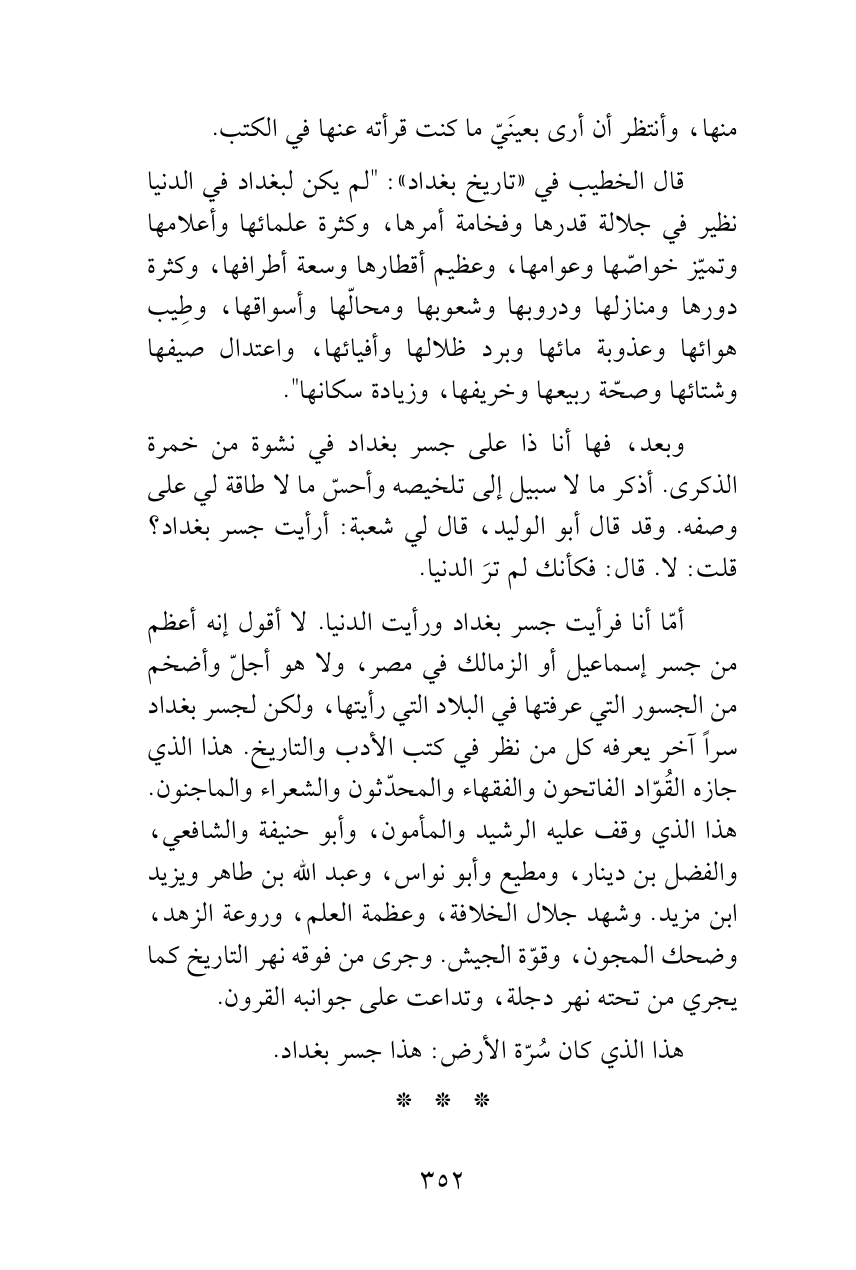 أمّا أنا فرأيت جسر بغداد ورأيت الدنيا. لا أقول إنه أعظم من جسر إسماعيل أو الزمالك في مصر، ولا هو أجلّ وأضخم من الجسور التي عرفتها في البلاد التي رأيتها، ولكن لجسر بغداد سراً آخر يعرفه كل من نظر في كتب الأدب والتاريخ. هذا الذي جازه القُوّاد الفاتحون والفقهاء والمحدّثون والشعراء والماجنون. هذا الذي وقف عليه الرشيد والمأمون، وأبو حنيفة والشافعي، والفضل بن دينار، ومطيع وأبو نواس، وعبد الله بن طاهر ويزيد ابن مزيد. وشهد جلال الخلافة، وعظمة العلم، وروعة الزهد، وضحك المجون، وقوّة الجيش. وجرى من فوقه نهر التاريخ كما يجري من تحته نهر دجلة، وتداعت على جوانبه القرون.