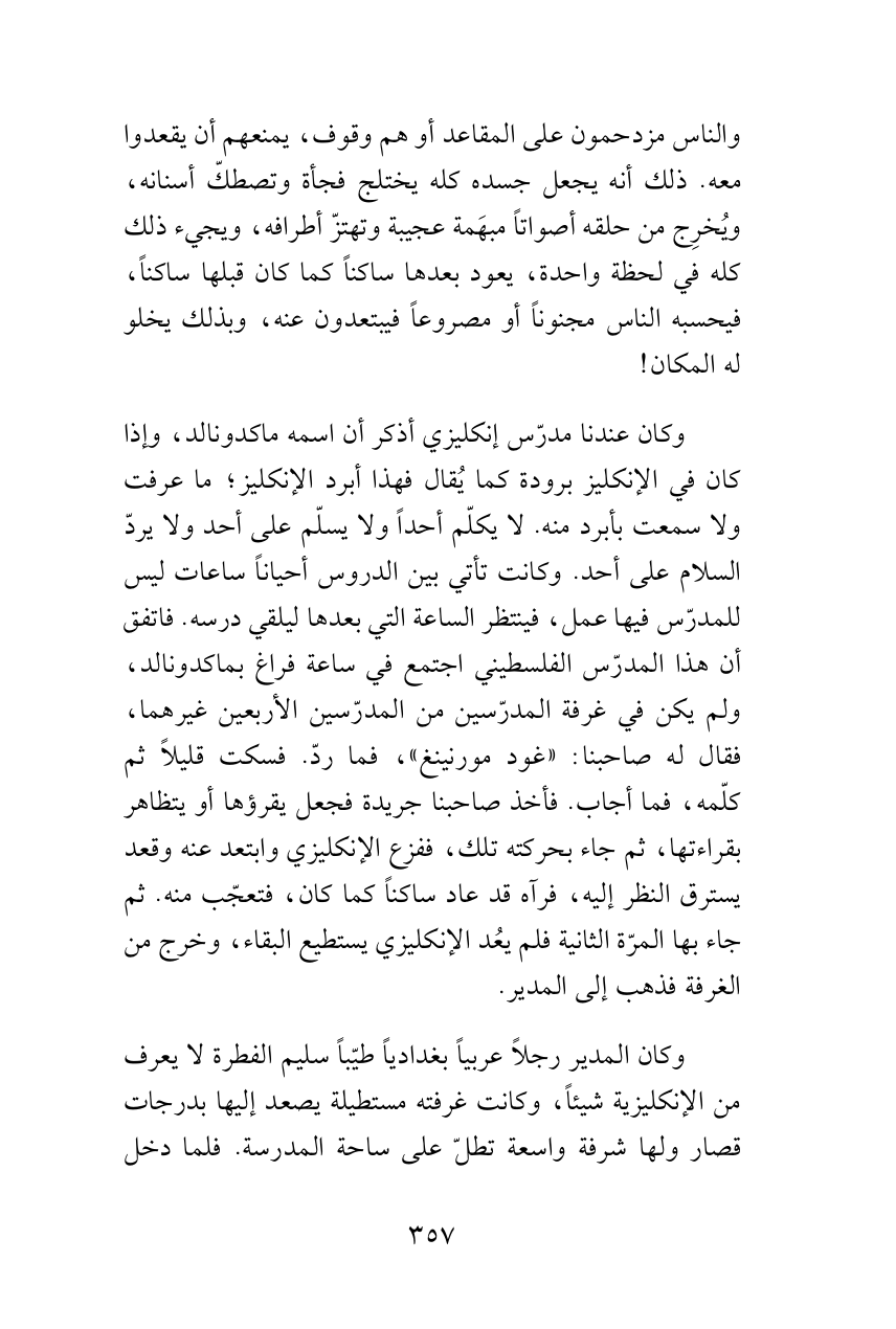 وكان عندنا مدرّس إنكليزي أذكر أن اسمه ماكدونالد، وإذا كان في الإنكليز برودة كما يُقال فهذا أبرد الإنكليز؛ ما عرفت ولا سمعت بأبرد منه. لا يكلّم أحداً ولا يسلّم على أحد ولا يردّ السلام على أحد. وكانت تأتي بين الدروس أحياناً ساعات ليس للمدرّس فيها عمل، فينتظر الساعة التي بعدها ليلقي درسه. فاتفق أن هذا المدرّس الفلسطيني اجتمع في ساعة فراغ بماكدونالد، ولم يكن في غرفة المدرّسين من المدرّسين الأربعين غيرهما، فقال له صاحبنا: «غود مورنينغ»، فما ردّ. فسكت قليلاً ثم كلّمه، فما أجاب. فأخذ صاحبنا جريدة فجعل يقرؤها أو يتظاهر بقراءتها، ثم جاء بحركته تلك، ففزع الإنكليزي وابتعد عنه وقعد يسترق النظر إليه، فرآه قد عاد ساكناً كما كان، فتعجّب منه. ثم جاء بها المرّة الثانية فلم يعُد الإنكليزي يستطيع البقاء، وخرج من الغرفة فذهب إلى المدير.