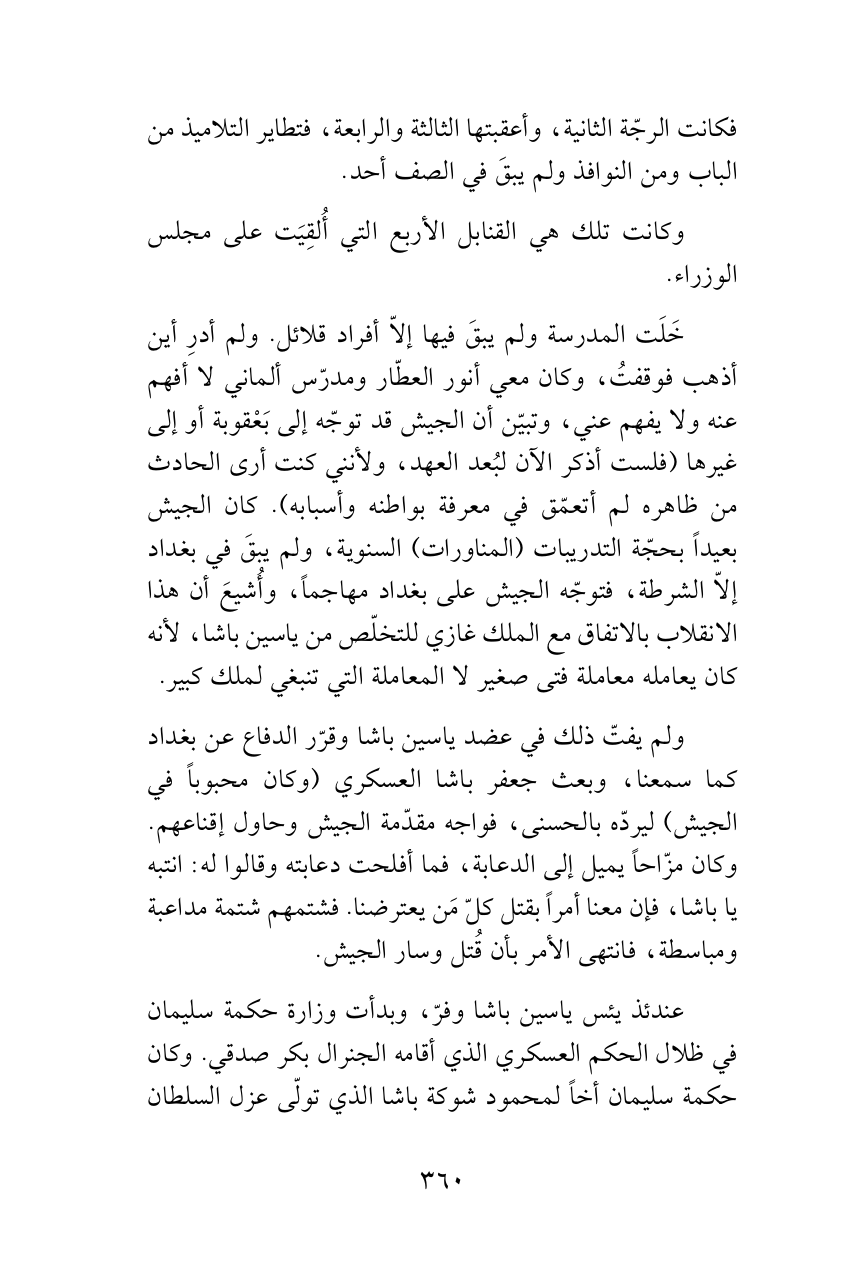 خَلَت المدرسة ولم يبقَ فيها إلاّ أفراد قلائل. ولم أدرِ أين أذهب فوقفتُ، وكان معي أنور العطّار ومدرّس ألماني لا أفهم عنه ولا يفهم عني، وتبيّن أن الجيش قد توجّه إلى بَعْقوبة أو إلى غيرها (فلست أذكر الآن لبُعد العهد، ولأنني كنت أرى الحادث من ظاهره لم أتعمّق في معرفة بواطنه وأسبابه). كان الجيش بعيداً بحجّة التدريبات (المناورات) السنوية، ولم يبقَ في بغداد إلاّ الشرطة، فتوجّه الجيش على بغداد مهاجماً، وأُشيعَ أن هذا الانقلاب بالاتفاق مع الملك غازي للتخلّص من ياسين باشا، لأنه كان يعامله معاملة فتى صغير لا المعاملة التي تنبغي لملك كبير.