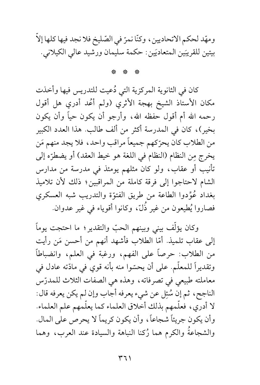 وكان يؤلّف بيني وبينهم الحبّ والتقدير؛ ما احتجت يوماً إلى عقاب تلميذ. أمّا الطلاب فأشهد أنهم من أحسن مَن رأيت من الطلاب: حرصاً على الفهم، ورغبة في العلم، وانضباطاً وتقديراً للمعلّم. على أن يحسّوا منه بأنه قوي في مادّته عادل في معاملته طبيعي في تصرفاته، وهذه هي الصفات الثلاث للمدرّس الناجح، ثم إن سُئِل عن شيء يعرفه أجاب وإن لم يكن يعرفه قال: لا أدري، فعلّمهم بذلك أخلاق العلماء كما يعلّمهم علم العلماء. وأن يكون جريئاً شجاعاً، وأن يكون كريماً لا يحرص على المال. والشجاعةُ والكرم هما رُكنا النباهة والسيادة عند العرب، وهما