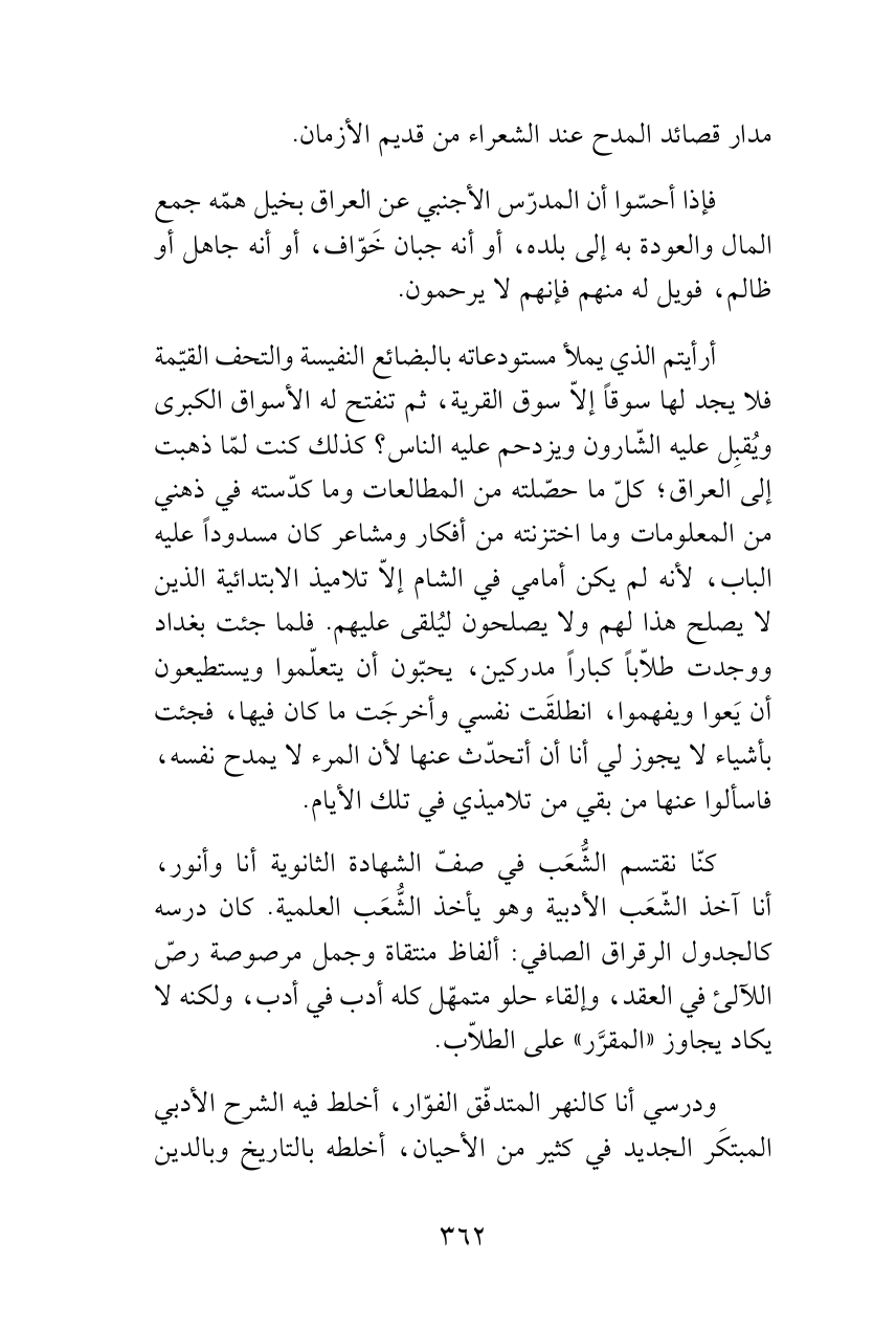 ودرسي أنا كالنهر المتدفّق الفوّار، أخلط فيه الشرح الأدبي المبتكَر الجديد في كثير من الأحيان، أخلطه بالتاريخ وبالدين
