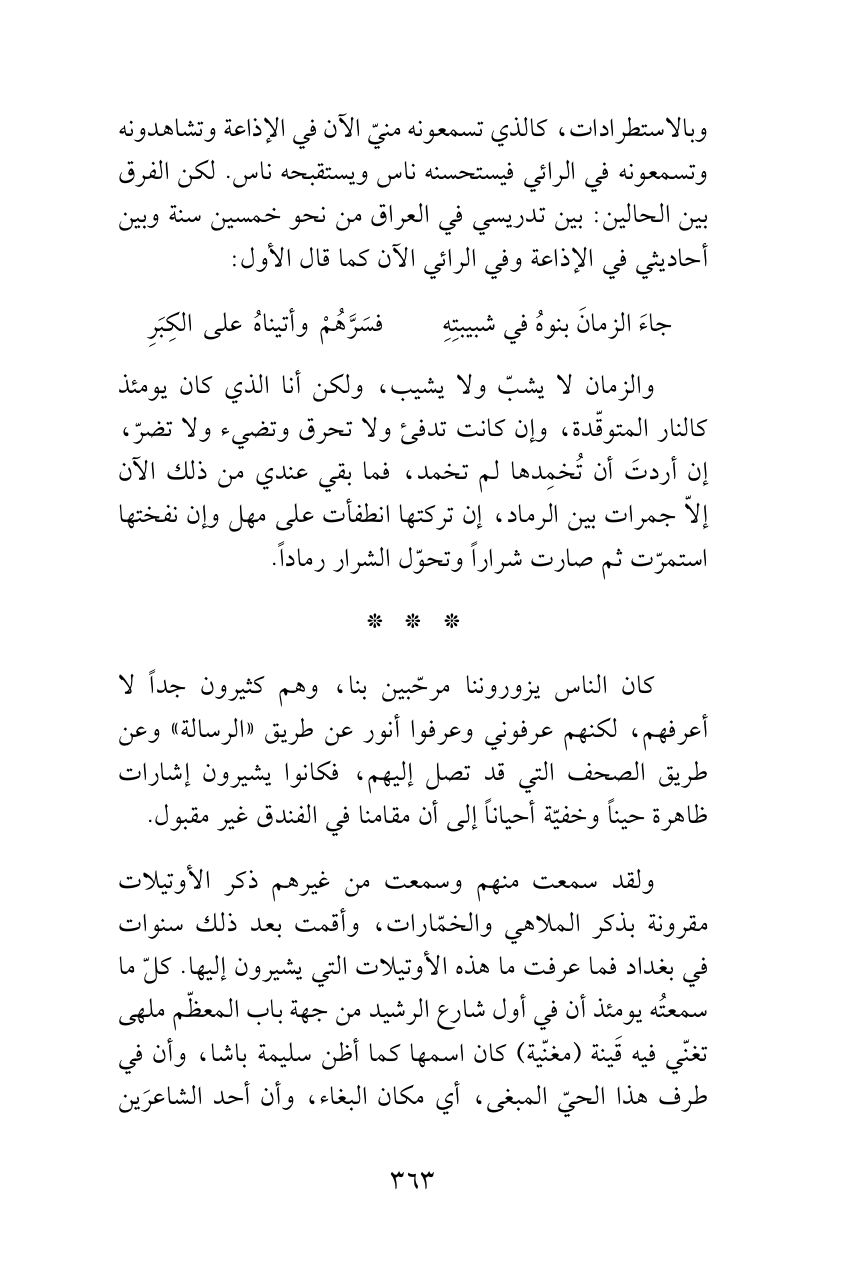 وبالاستطرادات، كالذي تسمعونه منيّ الآن في الإذاعة وتشاهدونه وتسمعونه في الرائي فيستحسنه ناس ويستقبحه ناس. لكن الفرق بين الحالين: بين تدريسي في العراق من نحو خمسين سنة وبين أحاديثي في الإذاعة وفي الرائي الآن كما قال الأول: