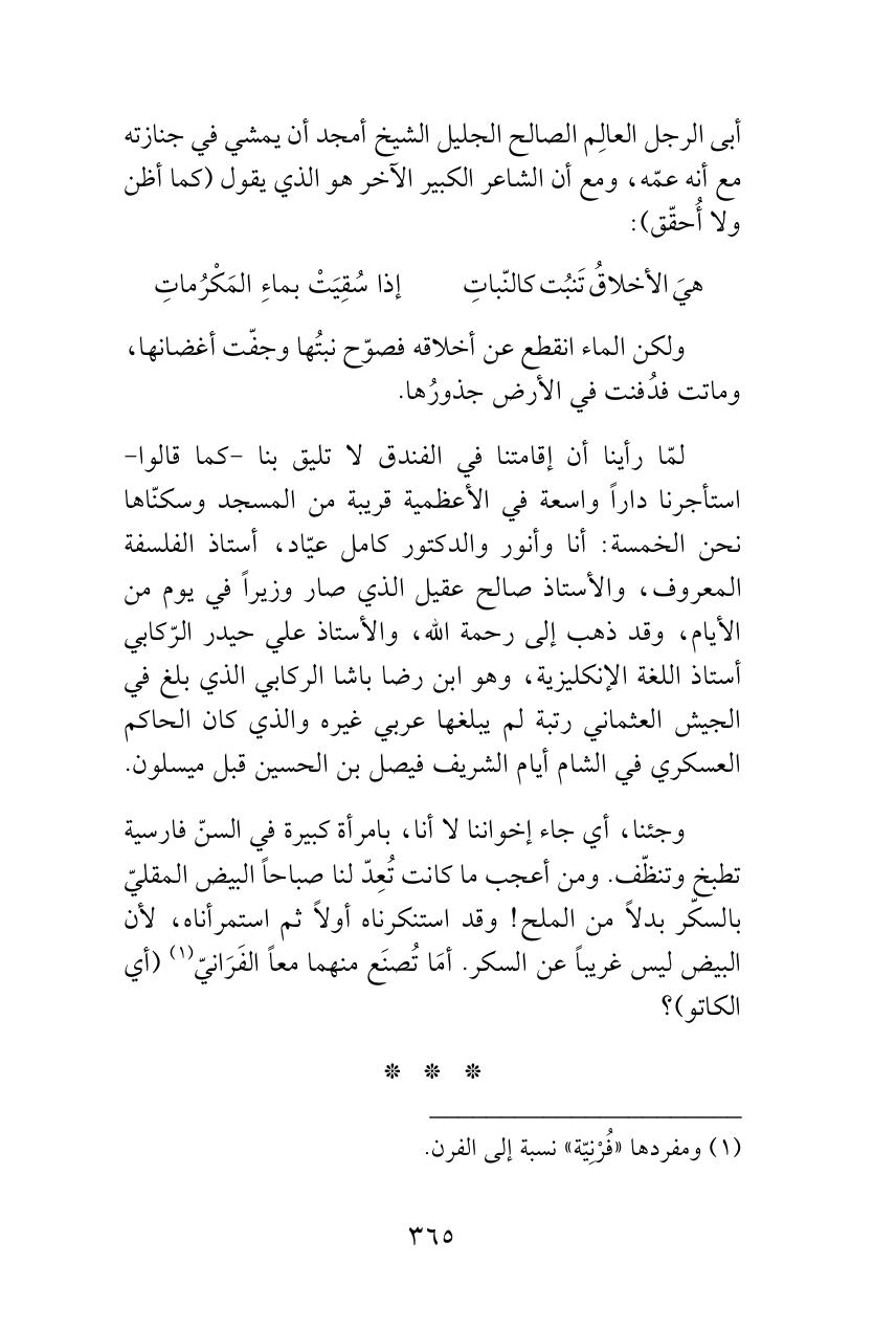 وجئنا، أي جاء إخواننا لا أنا، بامرأة كبيرة في السنّ فارسية تطبخ وتنظّف. ومن أعجب ما كانت تُعِدّ لنا صباحاً البيض المقليّ بالسكّر بدلاً من الملح! وقد استنكرناه أولاً ثم استمرأناه، لأن البيض ليس غريباً عن السكر. أمَا تُصنَع منهما معاً الفَرَانيّ (¬1) (أي الكاتو)؟