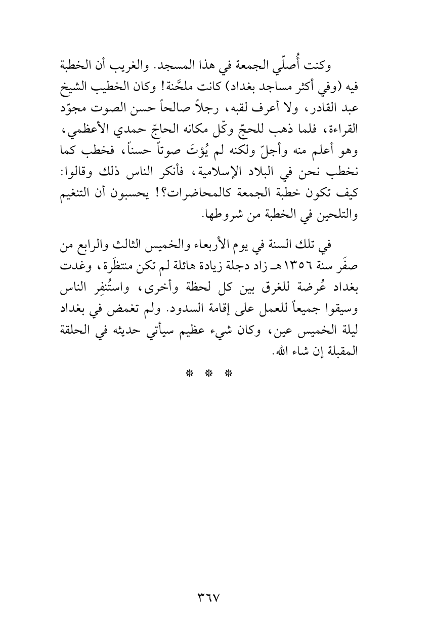 وكنت أُصلّي الجمعة في هذا المسجد. والغريب أن الخطبة فيه (وفي أكثر مساجد بغداد) كانت ملحَّنة! وكان الخطيب الشيخ عبد القادر، ولا أعرف لقبه، رجلاً صالحاً حسن الصوت مجوّد القراءة، فلما ذهب للحجّ وكّل مكانه الحاجّ حمدي الأعظمي، وهو أعلم منه وأجلّ ولكنه لم يُؤتَ صوتاً حسناً، فخطب كما نخطب نحن في البلاد الإسلامية، فأنكر الناس ذلك وقالوا: كيف تكون خطبة الجمعة كالمحاضرات؟! يحسبون أن التنغيم والتلحين في الخطبة من شروطها.