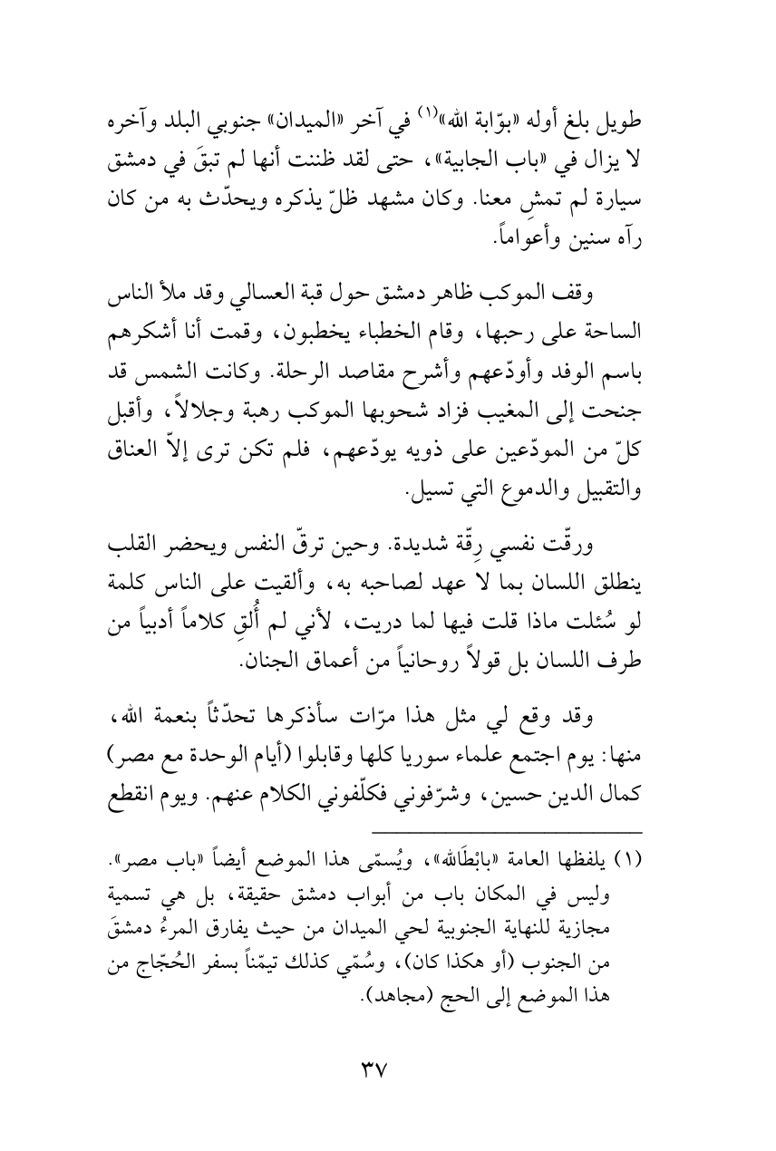 وقف الموكب ظاهر دمشق حول قبة العسالي وقد ملأ الناس الساحة على رحبها، وقام الخطباء يخطبون، وقمت أنا أشكرهم باسم الوفد وأودّعهم وأشرح مقاصد الرحلة. وكانت الشمس قد جنحت إلى المغيب فزاد شحوبها الموكب رهبة وجلالاً، وأقبل كلّ من المودّعين على ذويه يودّعهم، فلم تكن ترى إلاّ العناق والتقبيل والدموع التي تسيل.