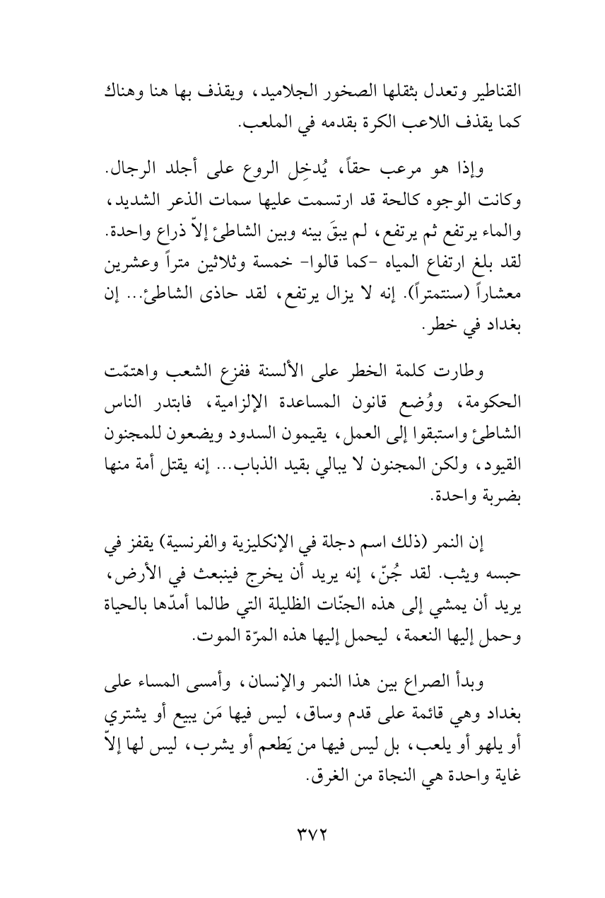 وإذا هو مرعب حقاً، يُدخِل الروع على أجلد الرجال. وكانت الوجوه كالحة قد ارتسمت عليها سمات الذعر الشديد، والماء يرتفع ثم يرتفع، لم يبقَ بينه وبين الشاطئ إلاّ ذراع واحدة. لقد بلغ ارتفاع المياه -كما قالوا- خمسة وثلاثين متراً وعشرين معشاراً (سنتمتراً). إنه لا يزال يرتفع، لقد حاذى الشاطئ ... إن بغداد في خطر.