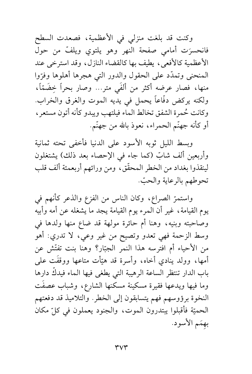 وكنت قد بلغت منزلي في الأعظمية، فصعدت السطح فانحسرَت أمامي صفحة النهر وهو يلتوي ويلفّ من حول الأعظمية كالأفعى، يطيف بها كالقضاء النازل، وقد استرخى عند المنحنى وتمدّد على الحقول والدور التي هجرها أهلوها وفرّوا منها، فصار عرضه أكثر من ألفَي متر ... وصار بحراً خِضَمّاً، ولكنه يركض دفّاعاً يحمل في يديه الموت والغرق والخراب. وكانت حُمرة الشفق تخالط الماء فيلتهب ويبدو كأنه أتون مستعر، أو كأنه جهنّم الحمراء، نعوذ بالله من جهنّم.
