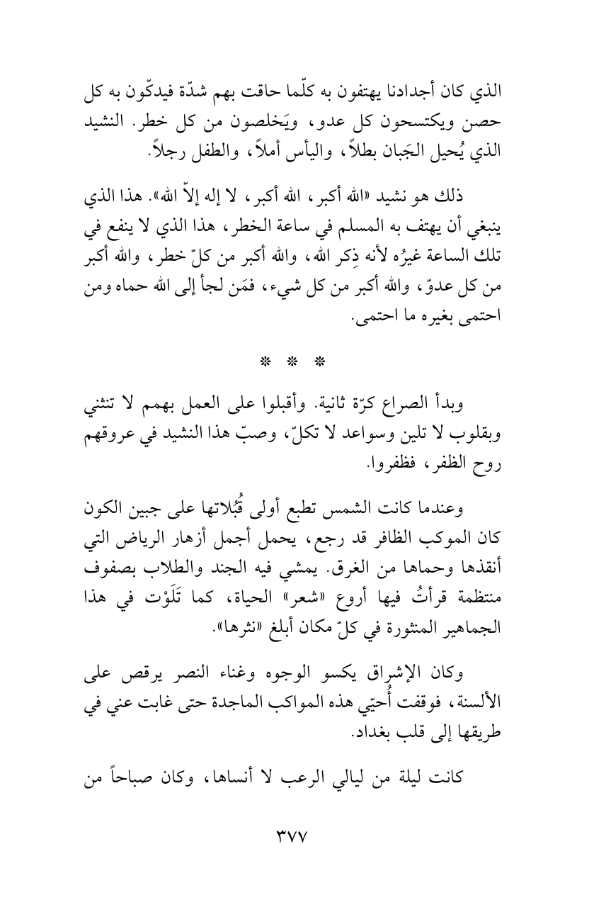ذلك هو نشيد «الله أكبر، الله أكبر، لا إله إلاّ الله». هذا الذي ينبغي أن يهتف به المسلم في ساعة الخطر، هذا الذي لا ينفع في تلك الساعة غيرُه لأنه ذِكر الله، والله أكبر من كلّ خطر، والله أكبر من كل عدوّ، والله أكبر من كل شيء، فمَن لجأ إلى الله حماه ومن احتمى بغيره ما احتمى.