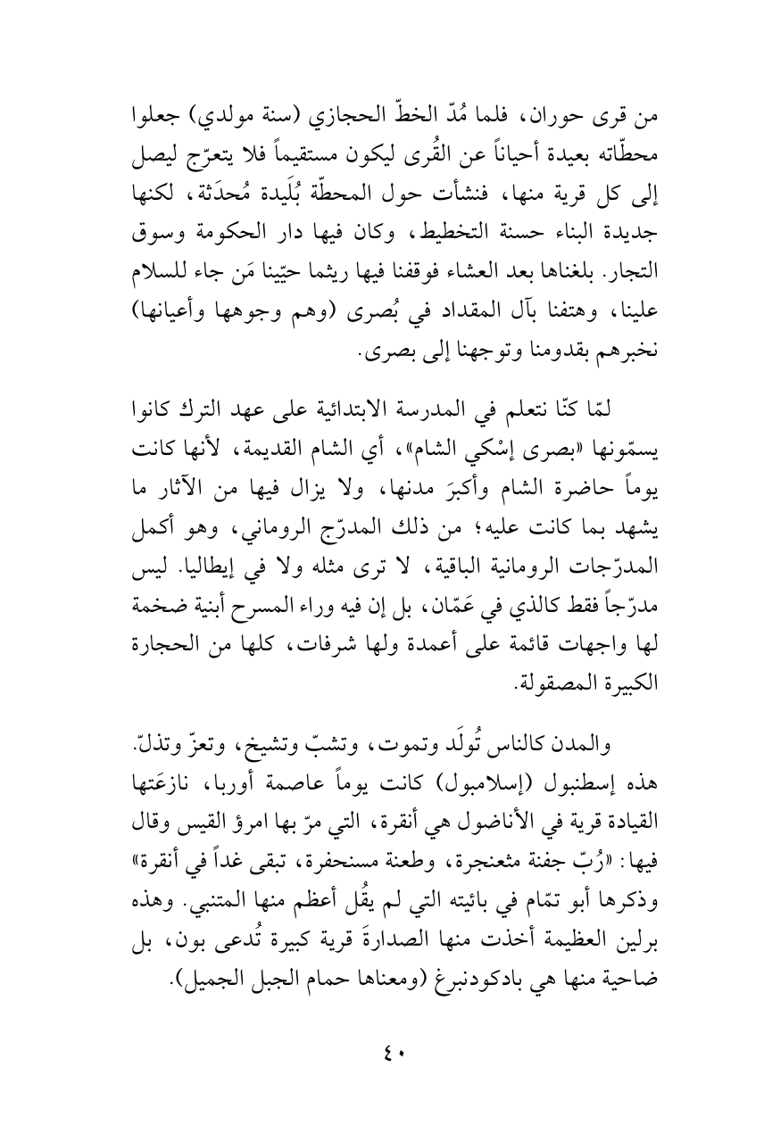 لمّا كنّا نتعلم في المدرسة الابتدائية على عهد الترك كانوا يسمّونها «بصرى إسْكي الشام»، أي الشام القديمة، لأنها كانت يوماً حاضرة الشام وأكبرَ مدنها، ولا يزال فيها من الآثار ما يشهد بما كانت عليه؛ من ذلك المدرّج الروماني، وهو أكمل المدرّجات الرومانية الباقية، لا ترى مثله ولا في إيطاليا. ليس مدرّجاً فقط كالذي في عَمّان، بل إن فيه وراء المسرح أبنية ضخمة لها واجهات قائمة على أعمدة ولها شرفات، كلها من الحجارة الكبيرة المصقولة.