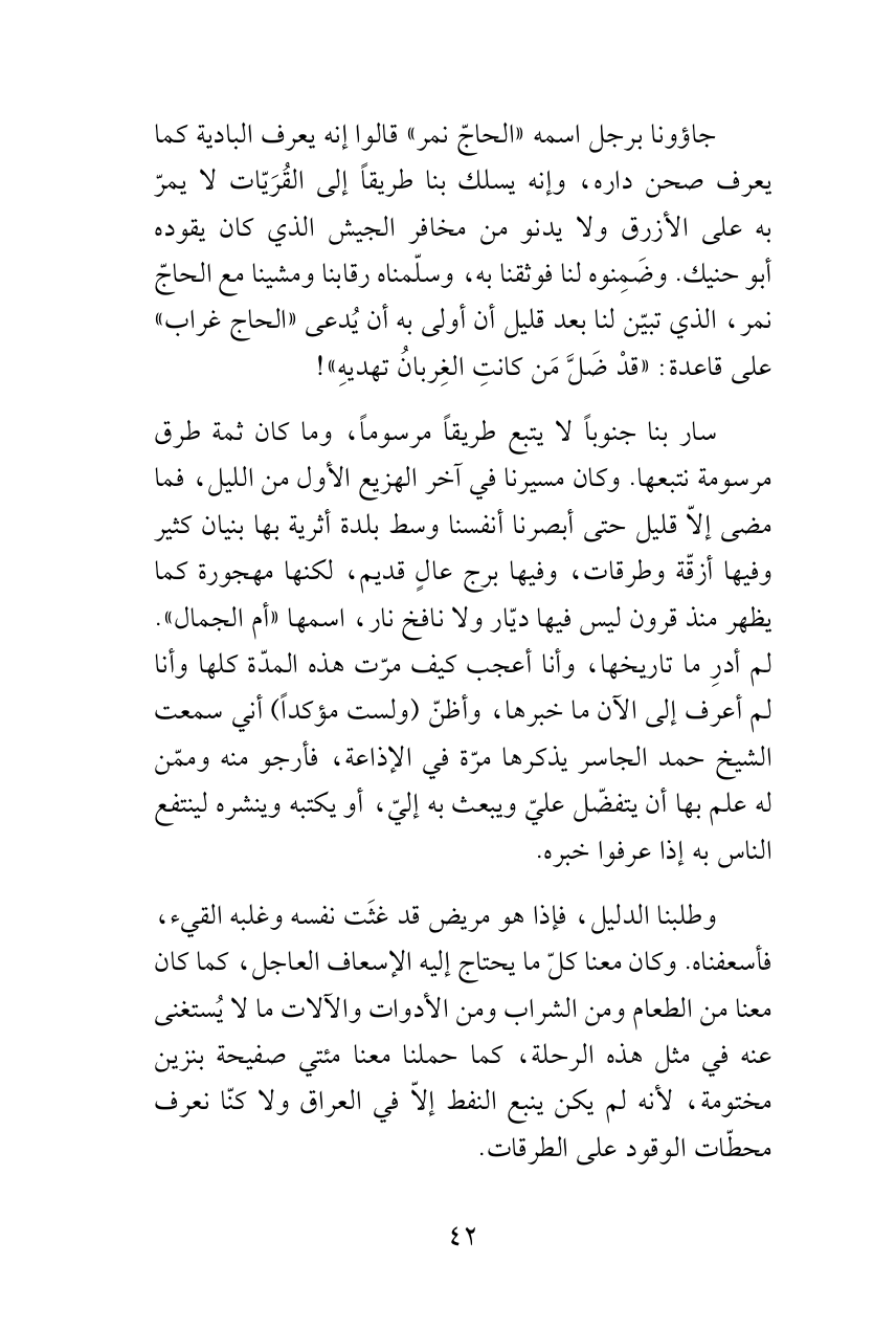 جاؤونا برجل اسمه «الحاجّ نمر» قالوا إنه يعرف البادية كما يعرف صحن داره، وإنه يسلك بنا طريقاً إلى القُرَيّات لا يمرّ به على الأزرق ولا يدنو من مخافر الجيش الذي كان يقوده أبوحنيك. وضَمِنوه لنا فوثقنا به، وسلّمناه رقابنا ومشينا مع الحاجّ نمر، الذي تبيّن لنا بعد قليل أن أولى به أن يُدعى «الحاج غراب» على قاعدة: «قدْ ضَلَّ مَن كانتِ الغِربانُ تهديهِ»!