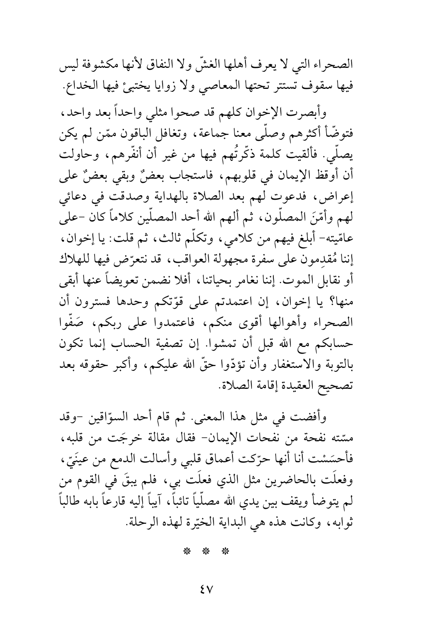وأبصرت الإخوان كلهم قد صحوا مثلي واحداً بعد واحد، فتوضّأ أكثرهم وصلّى معنا جماعة، وتغافل الباقون ممّن لم يكن يصلّي. فألقيت كلمة ذكّرتُهم فيها من غير أن أنفّرهم، وحاولت أن أوقظ الإيمان في قلوبهم، فاستجاب بعضٌ وبقي بعضٌ على إعراض، فدعوت لهم بعد الصلاة بالهداية وصدقت في دعائي لهم وأمّنَ المصلّون، ثم ألهم الله أحد المصلّين كلاماً كان -على عامّيته- أبلغ فيهم من كلامي، وتكلّم ثالث، ثم قلت: يا إخوان، إننا مُقدِمون على سفرة مجهولة العواقب، قد نتعرّض فيها للهلاك أو نقابل الموت. إننا نغامر بحياتنا، أفلا نضمن تعويضاً عنها أبقى منها؟ يا إخوان، إن اعتمدتم على قوّتكم وحدها فسترون أن الصحراء وأهوالها أقوى منكم، فاعتمدوا على ربكم، صَفّوا حسابكم مع الله قبل أن تمشوا. إن تصفية الحساب إنما تكون بالتوبة والاستغفار وأن تؤدّوا حقّ الله عليكم، وأكبر حقوقه بعد تصحيح العقيدة إقامة الصلاة.