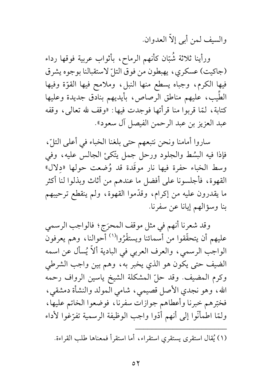 ورأينا ثلاثة شُبّان كأنهم الرماح، بأثواب عربية فوقها رداء (جاكيت) عسكري، يهبطون من فوق التلّ لاستقبالنا بوجوه يشرق فيها الكرم، وجباه يسطع منها النبل، وملامح فيها القوّة وفيها الطِّيب، عليهم مناطق الرصاص، بأيديهم بنادق جديدة وعليها كتابة، لمّا قربوا منا قرأتها فوجدت فيها: «وقف لله تعالى، وقفه عبد العزيز بن عبد الرحمن الفيصل آل سعود».