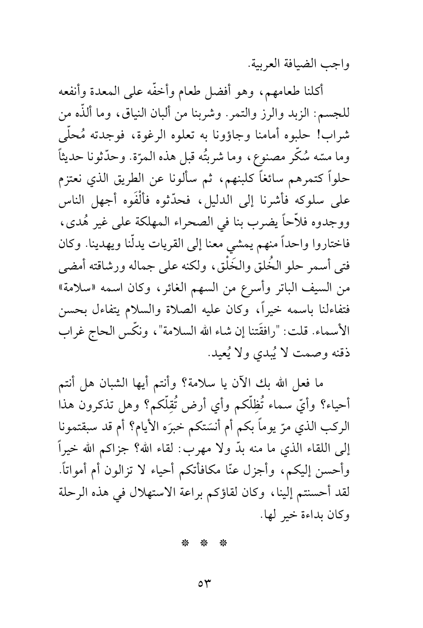 أكلنا طعامهم، وهو أفضل طعام وأخفّه على المعدة وأنفعه للجسم: الزبد والرز والتمر. وشربنا من ألبان النياق، وما ألذّه من شراب! حلبوه أمامنا وجاؤونا به تعلوه الرغوة، فوجدته مُحلّى وما مسّه سُكّر مصنوع، وما شربتُه قبل هذه المرّة. وحدّثونا حديثاً حلواً كتمرهم سائغاً كلبنهم، ثم سألونا عن الطريق الذي نعتزم على سلوكه فأشرنا إلى الدليل، فحدّثوه فألْفَوه أجهل الناس ووجدوه فلاّحاً يضرب بنا في الصحراء المهلكة على غير هُدى، فاختاروا واحداً منهم يمشي معنا إلى القريات يدلّنا ويهدينا. وكان فتى أسمر حلو الخُلق والخَلْق، ولكنه على جماله ورشاقته أمضى من السيف الباتر وأسرع من السهم الغائر، وكان اسمه «سلامة» فتفاءلنا باسمه خيراً، وكان عليه الصلاة والسلام يتفاءل بحسن الأسماء. قلت: "رافقَتنا إن شاء الله السلامة"، ونكّس الحاج غراب ذقنه وصمت لا يُبدي ولا يُعيد.