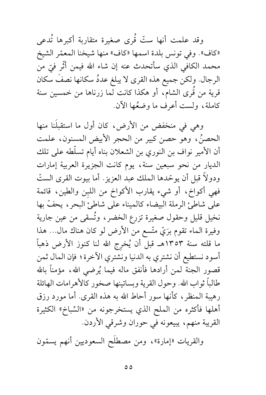 وهي في منخفض من الأرض، كان أول ما استقبلَنا منها الحصنُ، وهو حصن كبير من الحجر الأبيض المسنون، علمت أن الأمير نواف بن النوري بن الشعلان بناه أيام تسلّطه على تلك الديار من نحو سبعين سنة، يوم كانت الجزيرة العربية إمارات ودولاً قبل أن يوحّدها الملك عبد العزيز. أما بيوت القرى الستّ فهي أكواخ، أو شيء يقارب الأكواخ من اللبِن والطين، قائمة على شاطئ الرملة البيضاء كالميناء على شاطئ البحر، يحفّ بها نخيل قليل وحقول صغيرة تزرع الخضر، وتُسقى من عين جارية وفيرة الماء تقوم برَيّ متّسع من الأرض لو كان هناك مال ... هذا ما قلته سنة 1353هـ قبل أن يُخرِج الله لنا كنوز الأرض ذهباً أسود نستطيع أن نشتري به الدنيا ونشتري الآخرة؛ فإن المال ثمن قصور الجنة لمن أرادها فأنفق ماله فيما يُرضي الله، مؤمناً بالله طالباً ثواب الله. وحول القرية وبساتينها صخور كالأهرامات الهائلة رهيبة المنظر، كأنها سور أحاط الله به هذه القرى. أما مورد رزق أهلها فأكثره من الملح الذي يستخرجونه من «السِّباخ» الكثيرة القريبة منهم، يبيعونه في حوران وشرقي الأردن.